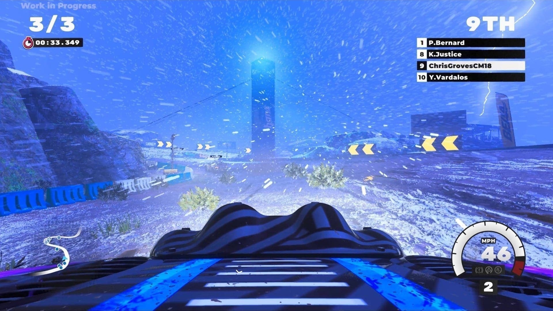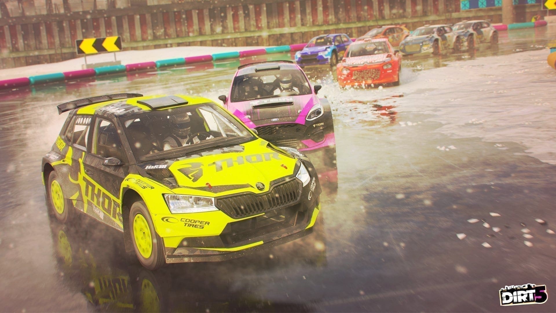 Eines der Geheimnisse hinter dem, soviel sei bereits verraten, geglückten Abzweigen auf „100% Arcade“ für DiRT5, war sicherlich der Wechsel des dafür verantwortlichen Studios. Um jedwede Betriebsblindheit und zu fest eingefahrene Ideen von vornherein zu vermeiden, durfte sich hier also erstmals in der Geschichte der Serie ein „Schwesterteam“ der Codemasters-Hauptcrew beweisen. Das Studio in Cheshire nämlich; formerly known as Codemasters Evo, formerly known as Evolution Studios. Ja, DIE Evolution Studios, die uns unter der Fuchtel von Sony einst solche Rennspielperlen wie die Playstation-exklusiven WRC-Teile, Motorstorm oder zuletzt Driveclub bescherten, bevor sie von den Japanern hätten aufgelöst werden sollen, dann aber von Codemasters übernommen wurden. Und somit auch ja: Die Entwickler, die zuletzt das relativ gefloppte Onrush auf die Welt losließen. Ein Spiel, aus dem sie wohl auch so einiges für DiRT5 mitnahmen. Die eigens entwickelte Engine beispielsweise, die schon in Onrush mit hoher Weitsicht und jeder Menge Effekte beeindrucken konnte. Stärken, die sie auch in DiRT5 nun gut ausspielen kann: Konfetti wabert über die Strecken, Feuerwerk sorgt für optischen Aufputz und vor allem das Wetter entpuppt sich als einer der heimlichen Helden des Spiels. Denn während Regen und Schnee anderswo nur optischer Schnickschnack sind, hat es hier tatsächlich transformative Wirkung auf das gesamte Geschehen. So kann es vorkommen, dass man in DiRT5 ein Rennen auf trockenem Schotter beginnt, aber auf Zentimeter-dicker Schneefahrbahn beendet, während Blitze effektvoll durch den dunkel gewordenen Nachthimmel zucken.