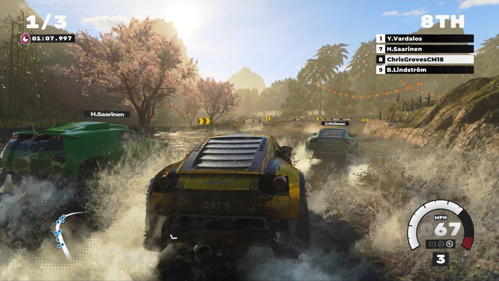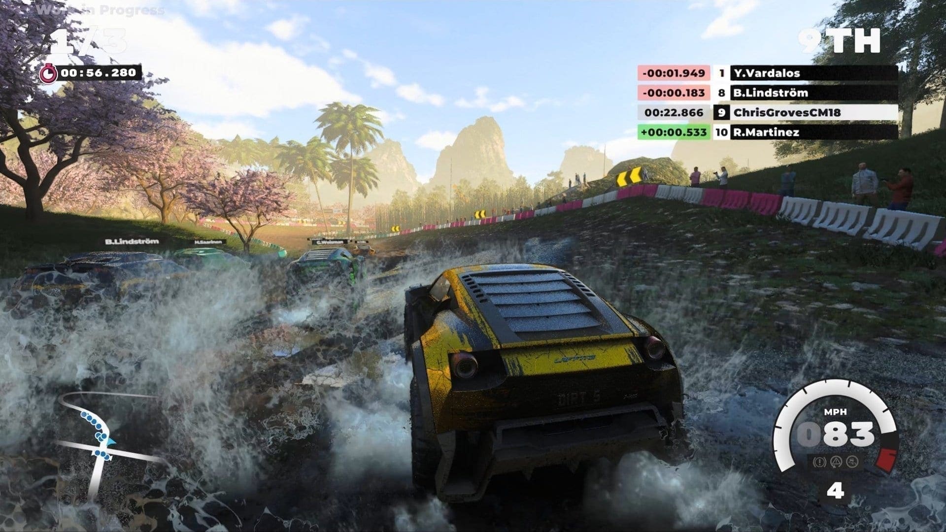 Und apropos „quer geht“: Natürlich darf man vom Handling-Modell von DiRT5 nicht einmal ansatzweise denselben Tiefgang wie von einem Dirt Rally 2.0 erwarten. Will heißen: Die Handbremse darf oft und frech benutzt werden, um die Autos in wilde Drifts zu werfen und während der Rennen entstehende Spurrillen sind deutlich mehr optisches Beiwerk als tatsächlich relevant für eure Linienwahl. Leider bedeutet das auch, dass sich die Autos lange nicht so „geerdet“ und tatsächlich in den Dreck fressend anfühlen wie im Simulations-Bruder. Dafür haben Einsteiger freilich einen deutlich leichteren Start mit dem Spiel und werden schnell erste Erfolge feiern können: auch mit einem Gamepad, das übrigens auch ich ausschließlich für den Test verwendet hab. Force-Feedback-Lenkräder werden zwar natürlich unterstützt, sind aber in meinen Augen dann doch knapp an „Perlen vor die Säue“ einzuordnen.