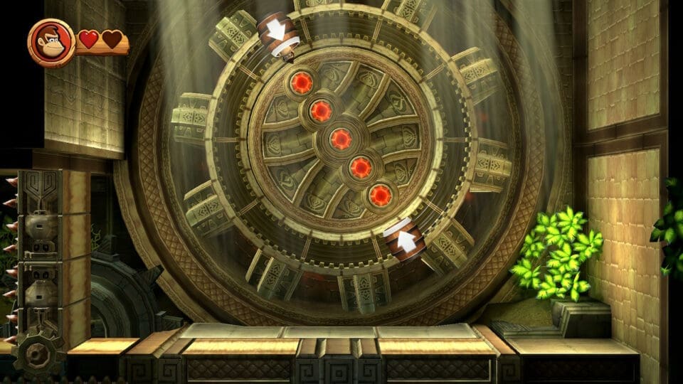 Donkey Kong Country Returns HD lässt Euch gleich zum Spielstart entscheiden, ob Ihr Euch im klassischen oder einem modernen Modus in das Abenteuer stürzen möchtet. Diese Modi unterscheiden sich dadurch, dass Ihr im modernen Modus ein zusätzliches Herz und Zugriff auf bestimmte Items habt, die Euch das Spielerlebnis erleichtern können. Die Items können in Cranky Kong’s Laden an bestimmten Punkten in der Spielwelt durch zuvor gefundene Bananenmünzen eingetauscht werden und lassen Euch beispielsweise einmal pro Level wiederauferstehen, wenn Ihr versehentlich in den Abgrund gesprungen seid. Aller Spielerehre zum Trotz solltet Ihr Euch am Anfang gut überlegen, welchen Modus Ihr bevorzugt – denn Donkey Kong Country Returns HD ist teilweise ein beinhartes Jump’n’Run und gerade auch die berühmt berüchtigten Loren- oder Raktenfasslevel können größeres Frustpotential bieten. Ein nachträglicher Wechsel vom einen in den anderen Modus ist im Übrigen nicht vorgesehen.