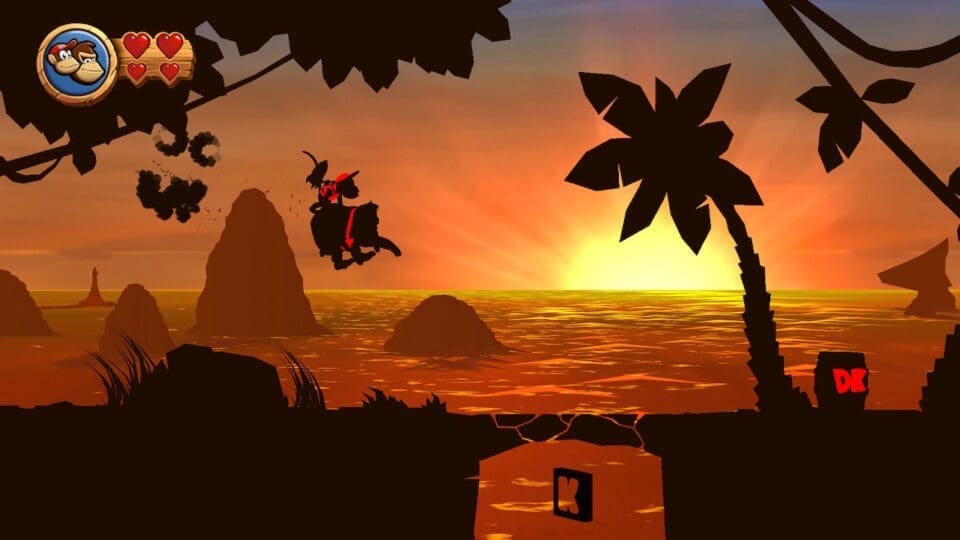 In Bezug auf das Leveldesgin muss sich Donkey Kong Country Returns HD nicht vor moderneren Jump’n’Run Spielen verstecken. In neun abwechslungsreich gestalteten Welten kämpft Ihr Euch auf Donkey Kongs Insel Stück für Stück durch ungefähr 80 Level voran. Dabei startet Ihr ganz klassisch im Dschungel, dann geht es weiter über ein Strandsetting, Ruinen, dunkle Höhlen, dichte Wälder, windige Klippen, Fabriken und Vulkane, bis Ihr am Ende am höchsten Punkt der Insel in den Wolken auf der Spitze eines Berges Euren gestohlenen Bananen nachjagt. Die unterschiedlichen Biome und die darin vorhandenen Gegner bieten sowohl optisch als auch spielerisch viel Abwechslung. Dabei überrascht Donkey Kong Country Returns HD auch mit ausgefallenen Ideen und ändert sich beispielsweise das Standsetting in einem Level dahingehend, dass Ihr nun plötzlich nur noch Schatten und Silhouetten vor dem Hintergrund einer untergehenden Sonne seht. Ebenso gibt es für alle Welten eigene Gegnertypen, die unterschiedliche Bewegungs- und Angriffsmuster haben und fast zu keinem Zeitpunkt das Gefühl aufkommen lassen, dass hier bloß durch einfaches Kopieren vorherige Gegner wiederverwertet worden sind.