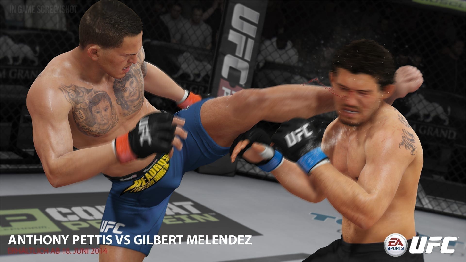 Aber auch einige der anderen Animationen machen deutlich, dass man es eben auch mit EAs Ignite Engine noch nicht ganz geschafft hat, eine Physik-Engine auf die Beine zu stellen, die es einem ermöglicht menschlichen Körpern so „Befehle“ zu geben, dass diese wirklich im Sinne von Aktion und Reaktion der beteiligten Körper und Kräfte perfekt simuliert werden. Damit will ich auf sehr umständliche weise sagen: Meist sehen die Animationen super aus, manchmal geht allerdings mit der Physik was schief … dann schaut‘s komisch aus. Und apropos „ausschauen“: Grafisch ist UFC wie gesagt sehr nett anzusehen – aber auch nicht mehr. Zumindest mich persönlich konnte das Spiel nicht beeindrucken. Das mag aber vor allem daran liegen, dass ich die Fight Night-Titel auf der „alten Generation“ kenne. Zumindest in meinen Augen ist der Qualitäts-Sprung hier nämlich nur marginal ausgefallen. Da ist noch Luft nach oben.