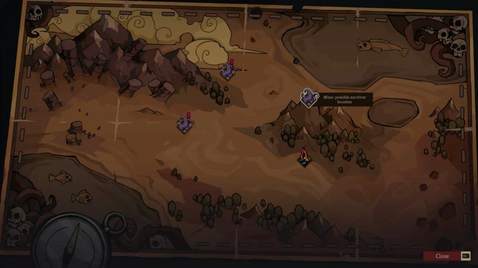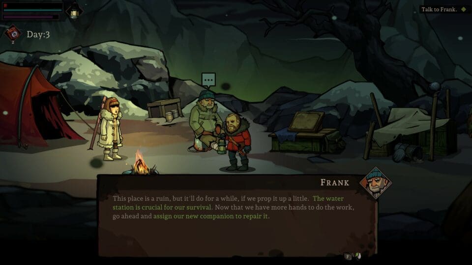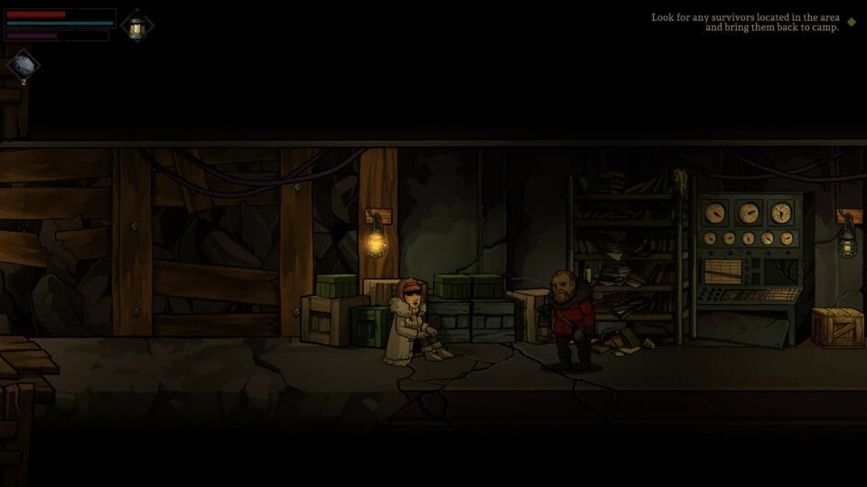 Das Spiel läuft tageweise ab, und besteht aus zwei unterschiedlichen Teilen. Einerseits managen wir die Basis in einem Strategieteil, andererseits erkunden wir bestimmte Orte in einem 2D Teil mit ein wenig Action. Kämpfen, schleichen, die Hotspots der Gegend erkunden, kleine Rätsel lösen. Erwartet euch nicht zu viel von den Kämpfen, die sind nicht unbedingt das Highlight des Games und sollten so oft wie möglich ganz vermieden werden.