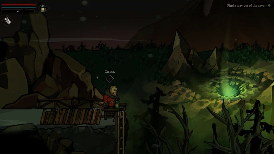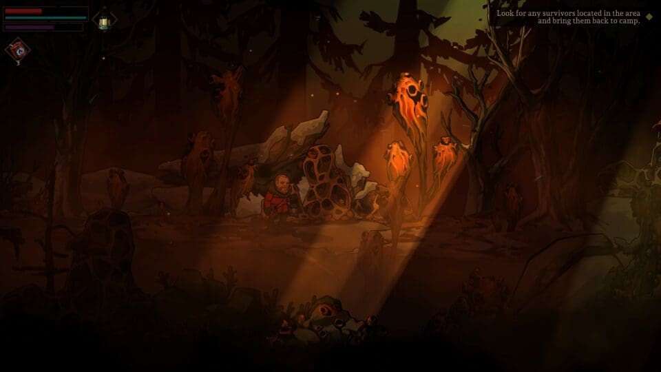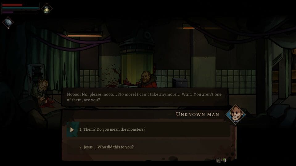 Der von der Spielzeit her umfangreichere Teil ist der 2D Teil. Vom Lager aus wählen wir unsere nächste Mission, wo wir uns dann in 2D durch die Gegend bewegen. Wir können laufen (solange unsere Kondition reicht), wir können schleichen, wir können Gegenstände benutzen wie beispielsweise ein Messer, eine Axt, eine Laterne oder Steine. Leider werden die Gegenstände schnell kaputt, der Lampe geht der Brennstoff aus und die verbrauchbaren Gegenstände sind generell nur in geringer Menge vorhanden. Also müssen wir am Weg alles einsammeln, was wir in Kisten, Truhen oder Schränken nur irgendwie finden können. In der Basis haben wir einen Arbeitstisch um aus gefundenen Ressourcen neue, wichtigere Dinge (z.B. Verbandszeug) zu basteln. Hier weisen wir auch den geretteten anderen Menschen – sofern wir bei unseren Erkundungszügen jemand retten konnten – eine Aufgabe zu. So wächst unsere Basis langsam an, und die anderen Bewohner kümmern sich beispielsweise um die Wasserversorgung und produzieren regelmäßig Ressourcen. Nicht benötigte Ressourcen lagern wir an einem sicheren Ort, um sie bei Bedarf herauszuholen und uns damit vor der nächsten Mission auszurüsten. Je mehr Leute wir im Lager haben, desto mehr Ressourcen benötigen wir. Wie gut, dass manchmal jemand verstirbt… Mit den anderen Überlebenden können wir reden, und im Zelt schlafen, um uns ein wenig zu erholen. Schwere Traumata, die wir im Laufe des Spieles erleiden, kriegen wir aber nicht so einfach weg. Werden wir verrückt oder entkommen wir diesem Albtraum schließlich auch wieder?