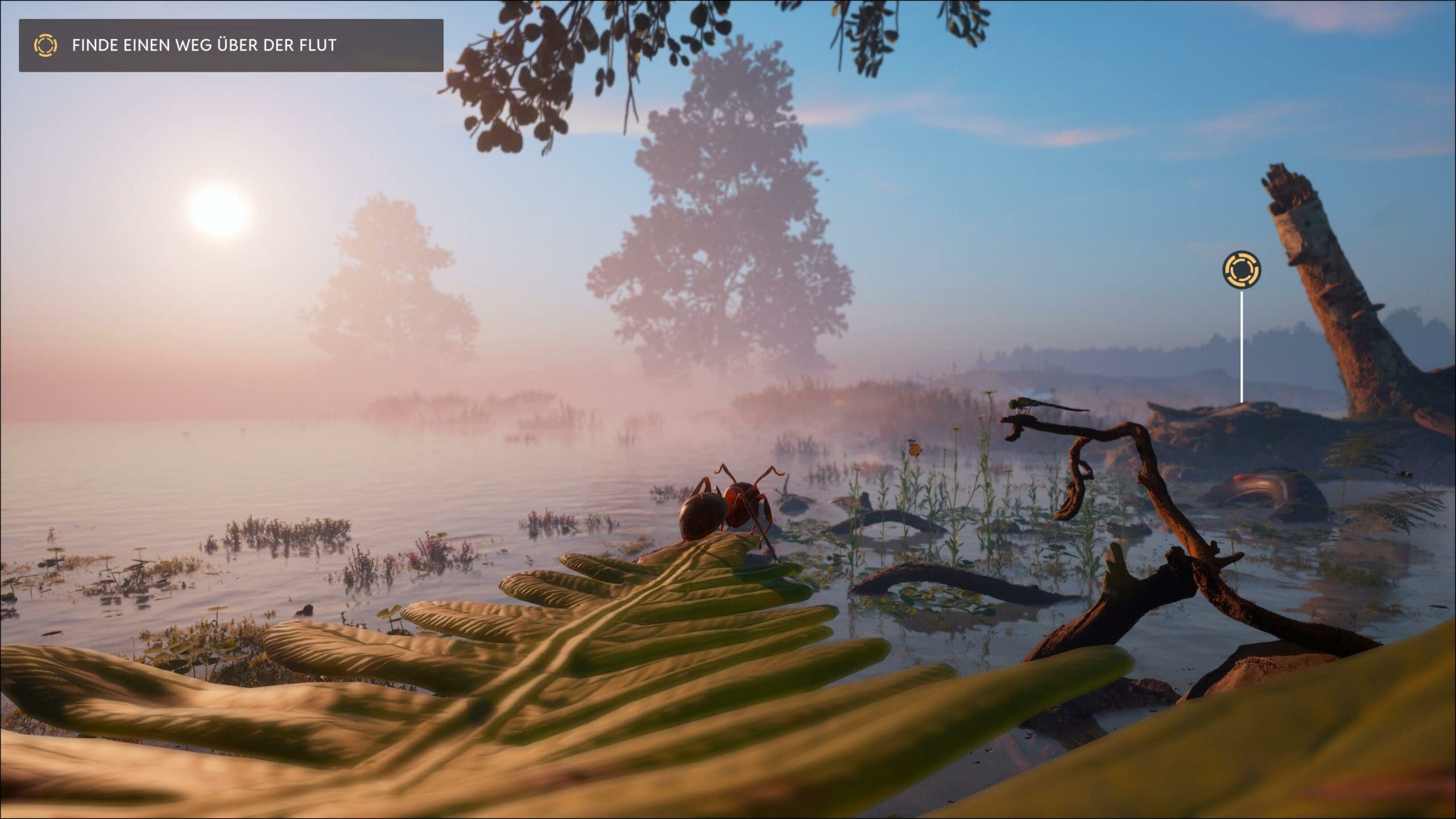 Die Spielwelt ist einfach nur wunderschön und richtig realistisch gestaltet. Trockene Stellen an Blättern, Schleimspuren von Schnecken oder die unterschiedlichen Untergründe, auf denen wir rumlaufen. Die Entwicklerinnen und Entwickler sind hier sehr nahe am Fotorealismus dran. Der Sound macht die Immersion dann wirklich perfekt. Wenn eine Libelle neben uns vorbeizieht, klingt das wie ein Helikopter.