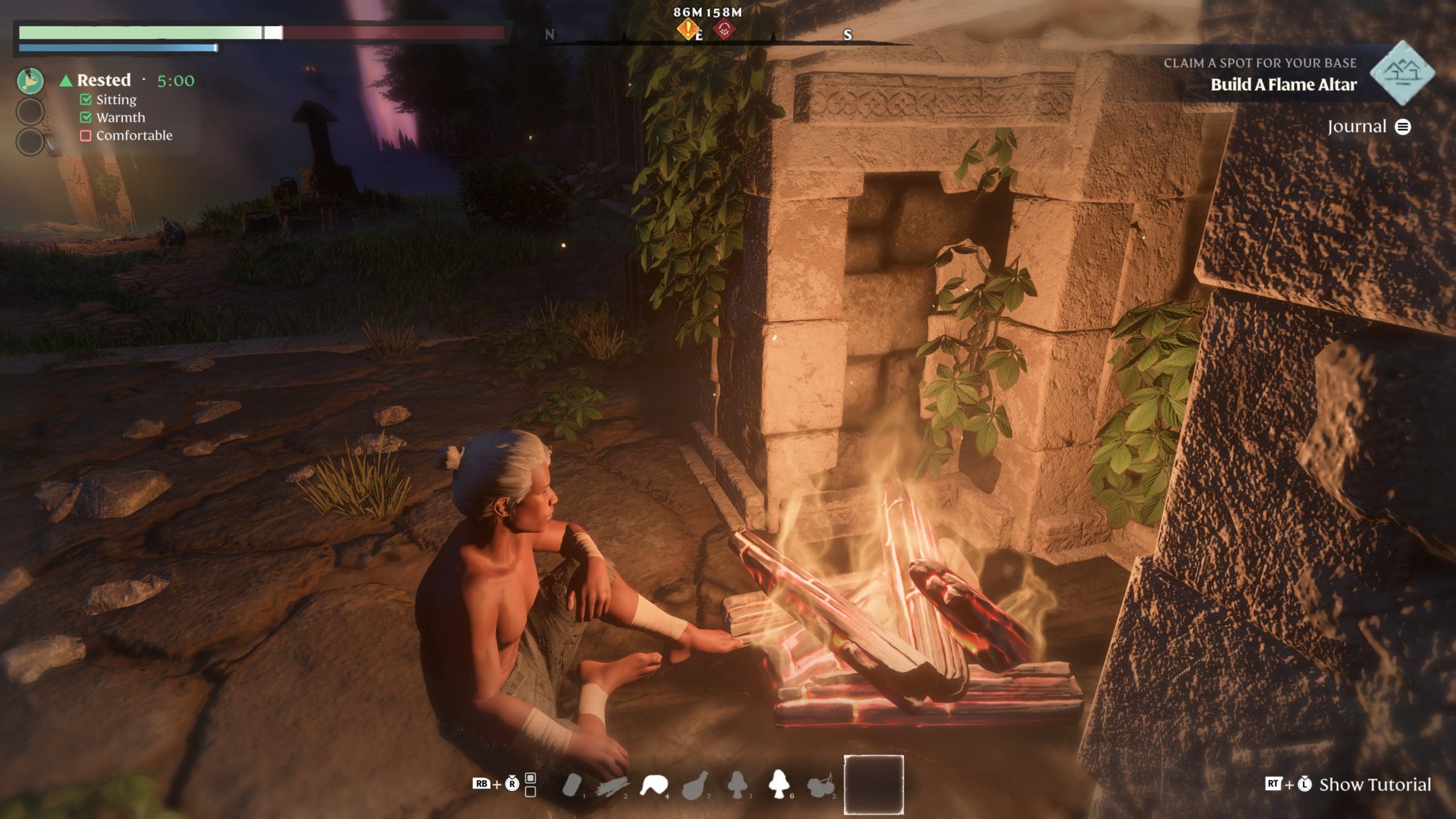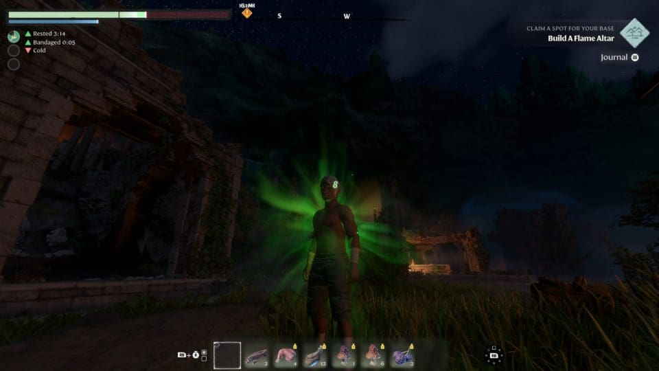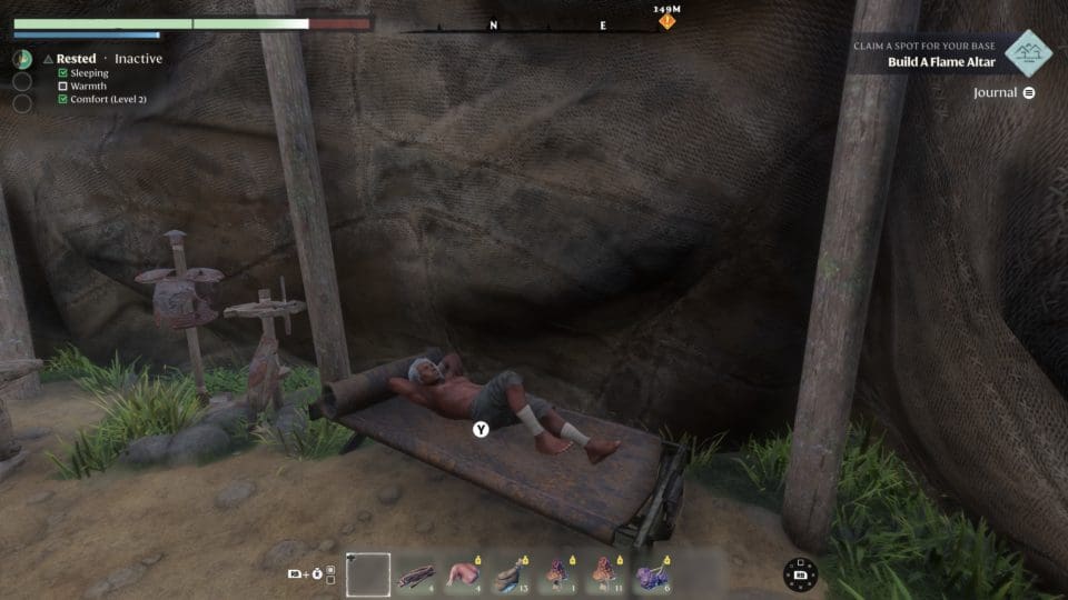 Zu Beginn des Spieles erstellen wir unseren Spielcharakter. Die Optionen sind nicht so extrem umfangreich und vor allem optischer Natur – Oberkörper, Geschlecht, Bart, Haar und Haarfarbe, dazu stehen mehrere Stimmen zur Wahl, viel mehr gibt es nicht. Immerhin dürfen wir uns auch einen Namen geben. Mit nur einer Unterhose (und einem BH, wenn wir eine Frau erstellt haben) bekleidet wachen wir auf (sorry, nackig gibt es in dem Spiel nicht) und beginnen gleich damit, die Umgebung zu erkunden und Ressourcen zu sammeln. Steine, Pilze, Holz, Fleisch, Obst, Waffen, Heiltränke und was eben so alles herumliegt. Keine Ahnung wo wir das alles hinstecken, aber wir können verdammt viel in unserer Unterhose tragen, bis wir überlastet sind. Die ersten Gegner erschlagen wir mit einer Fackel, zur Not auch mit den Fäusten. Während wir die Gegend erkunden, haben wir regelmäßig Geistesblitze und lernen Möglichkeiten, die gefundenen Ressourcen auch zum Basteln einzusetzen. Wir bauen also eine Werkbank, einen neuen Hammer, und vor allem zuerst einmal einen Altar der Flamme als Mittelpunkt unseres neuen Lagers.