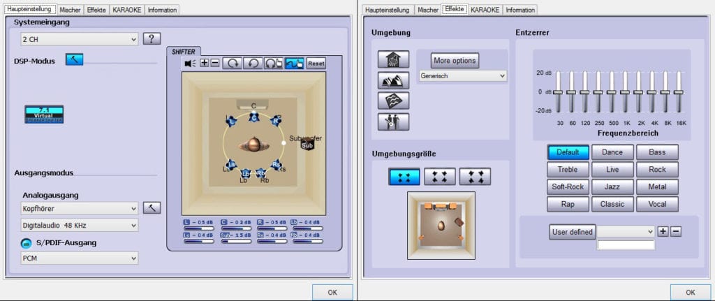 Um in den vollen Genuß aller Funktionsmöglichkeiten und vor allem auch dem 7.1 Surround-Sound zu kommen ist es notwendig die Hersteller-Software zu installieren. Über eine etwas altmodische Administrationsoberfläche lassen sich dann etliche Parameter verändern, darunter die Umschaltung zwischen Stereo und 7.1 Virtual Surround-Sound, sowie Einstellmöglichkeiten und Effekte für einzelne Kanäle, Lautstärke und die Anpassung von Höhen und Tiefen über einen eingebauten Equalizer.