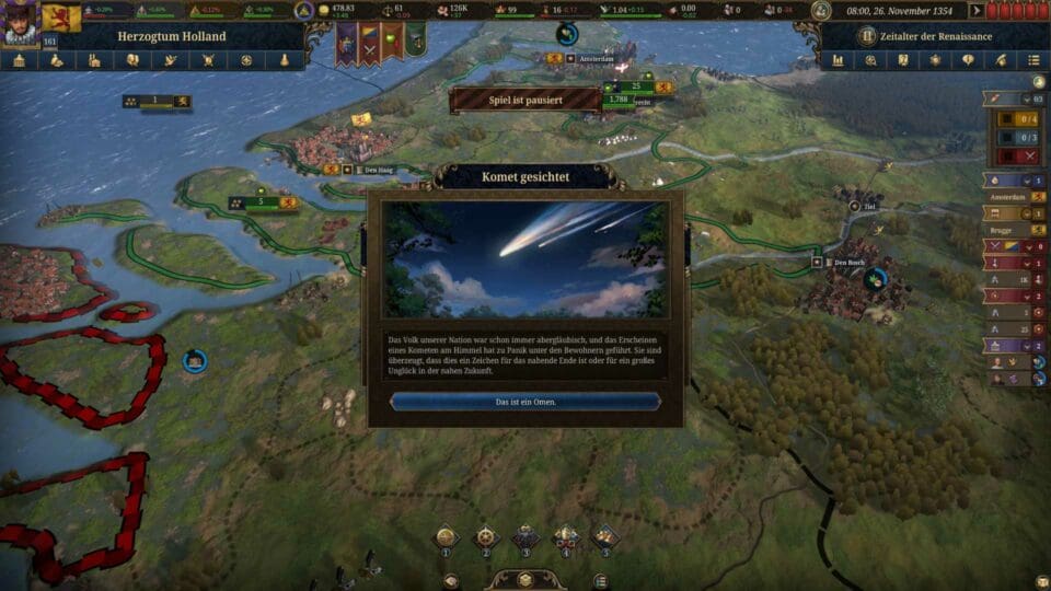 Mit all diesen Neuerungen versucht Europa Universalis V dosiert seiner Spielwelt ein Gesicht zu geben, ohne den starken Fokus auf Makropolitik zu verlieren. Denn machen wir uns nichts vor: Hinter all den schicken 3D-Porträts und kleinen Charaktergeschichten verbirgt sich nach wie vor das bekannte Paradox-Kernstück – ein gewaltiger Apparat aus Tabellen, Statistiken und Schiebereglern, der unbedingt beachtet und bedient werden will. Man sollte wie auch bei Stellaris oder Victoria 3 die Fähigkeit besitzen, die vielen abstrakten Elemente des Titels in der eigenen Vorstellung zu einer schlüssigen Erzählung zusammenzusetzen.