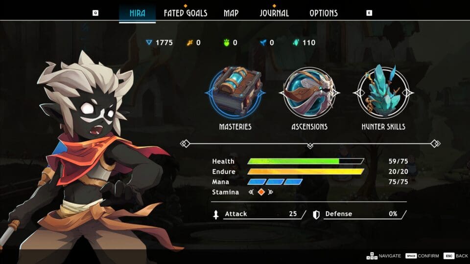 Hira steuert sich wie in den meisten 2D Metroidvanias üblich. Er kann springen, mit dem Schwert zuschlagen, Kisten schieben usw. Wenn ihr gegnerischen Angriffen erfolgreich ausweicht, könnt ihr besonders effektive Gegenangriffe durchführen. Besiegte Gegner lassen Kristalle (Korr Shards) fallen, mit denen ihr u.a. Missionen freischalten oder Güter und Dienstleistungen kaufen könnt. An Lagerfeuern könnt ihr euren Gesundheitsbalken wiederherstellen. Das Spiel zeichnet automatisch eine Karte mit. In einem Journal werden die offenen Missionen angeführt und in einem umfangreichen Fähigkeitsbaum könnt ihr Hira gegen Erfahrungspunkte (Fated Points genannt) verbessern (beispielsweise seine Angriffsstärke erhöhen) und neue Fähigkeiten freischalten. Auf euren Reisen lernt ihr viele Leute kennen, und eine ganze Menge davon werden eure Freunde und schließen sich euch (zumindest zeitweise) an und kommen in euer Lager (einem alten Tempel). Sie haben alle ihre eigenen Fähigkeiten, die ihr dann wie Zusatzfähigkeiten einsetzen könnt. Das funktioniert sowohl im Kampf, als auch außerhalb. Das Spiel wird an den in der Landschaft verteilten Schreinen gespeichert, dort könnt ihr euch auch ausrasten, eure Freunde anschauen oder die Schreine als Schnellreiseportale benutzen.