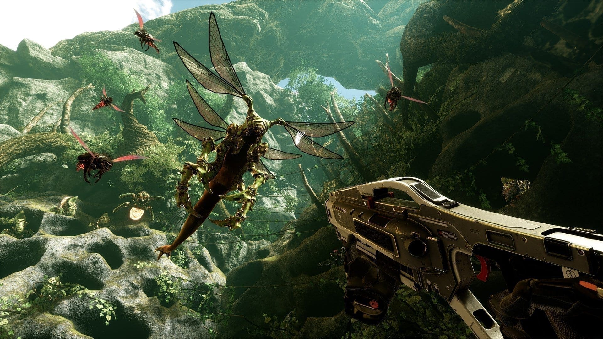 Es stehen euch in der aktuellen Version, vier Missionen zur Verfügung, diese versetzen euch in verschiedene, erzählerische abgeschlossene Geschichten, die keinen direkten Zusammenhang miteinander haben. Der einzige gemeinsame Nenner der Missionen ist, dass sie vom heimatlichen Planeten weit entfernt stattfinden, eben „Farhome“. Man kann sich frei entscheiden welche der Aufgaben man erleben will, es empfiehlt es sich dennoch die erste Mission für den Einstieg zu wählen. Hier kann man das Spiel kennen lernen, ohne in einer heillosen Überforderung zu enden und doch kann es hier schnell zur Enttäuschung kommen, die einem zum sofortigen Beenden des Spiels führt. Die erste Mission beginnt auf einem Waldplaneten, in einer Basis die gerade in Begriff ist von Käfern, in der Größe von Autos, überrannt zu werden. Hier schießt man sich seinen Weg durch Horden von Insekten und erarbeitet sich an der primären Waffe enorm viel Frust. Unser Gewehr lässt sich nicht nachladen, sondern es lädt sich selber wieder auf, wenn gerade nicht geschossen wird. Nur genau dies dauert, im Vergleich zu einem Magazinwechsel, welches meist wenige Sekunden benötigt, lange und so braucht das wieder aufladen etwa zehn Sekunden und mehr, was umzingelt von Arachnoiden, mehr als nur ungünstig ist. Diese Tatsache zwingt einem zur Hit’n Run-Taktik und kann schon den Frust so hochtreiben, dass man das Spiel gleich wieder beiseite legen möchte. Den ersten Ansturm überstanden bekommt man per Funk mitgeteilt, dass ein Wissenschaftler noch im Gelände verschollen ist, der unserer Rettung bedarf.