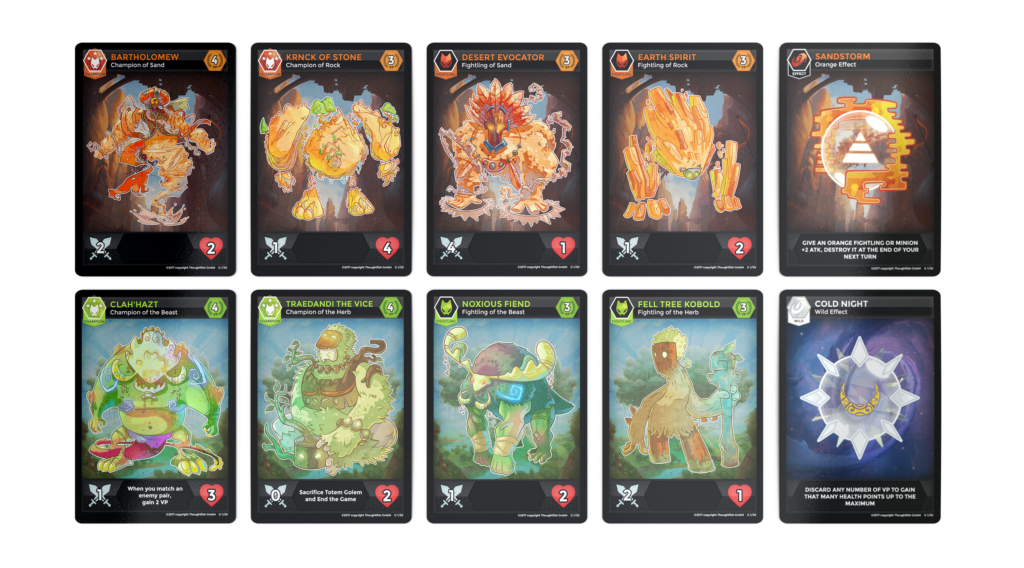 Geplant sind vorerst zwei Fraktionen: Leben (grün; Verteidigung und Zermürbung) und Stärke (orange; Kraft und Aufopferung). Wie im digitalen Fightlings-Game bestehen diese aus Champions, Fightlings, Minions und Effekten, wobei im Kartenspiel diese Unterteilung nicht ganz so bedeutsam ist, wie in der digitalen Version. Ein Deck besteht aus 17 Karten, dazu kommen noch “Wild Cards”, also fraktionsbasierte Fähigkeitskarten. Insgesamt soll das fertige Spiel über 100 qualitativ hochwertige Karten enthalten, aus dem man dann sein eigenes Deck zusammenstellen kann.