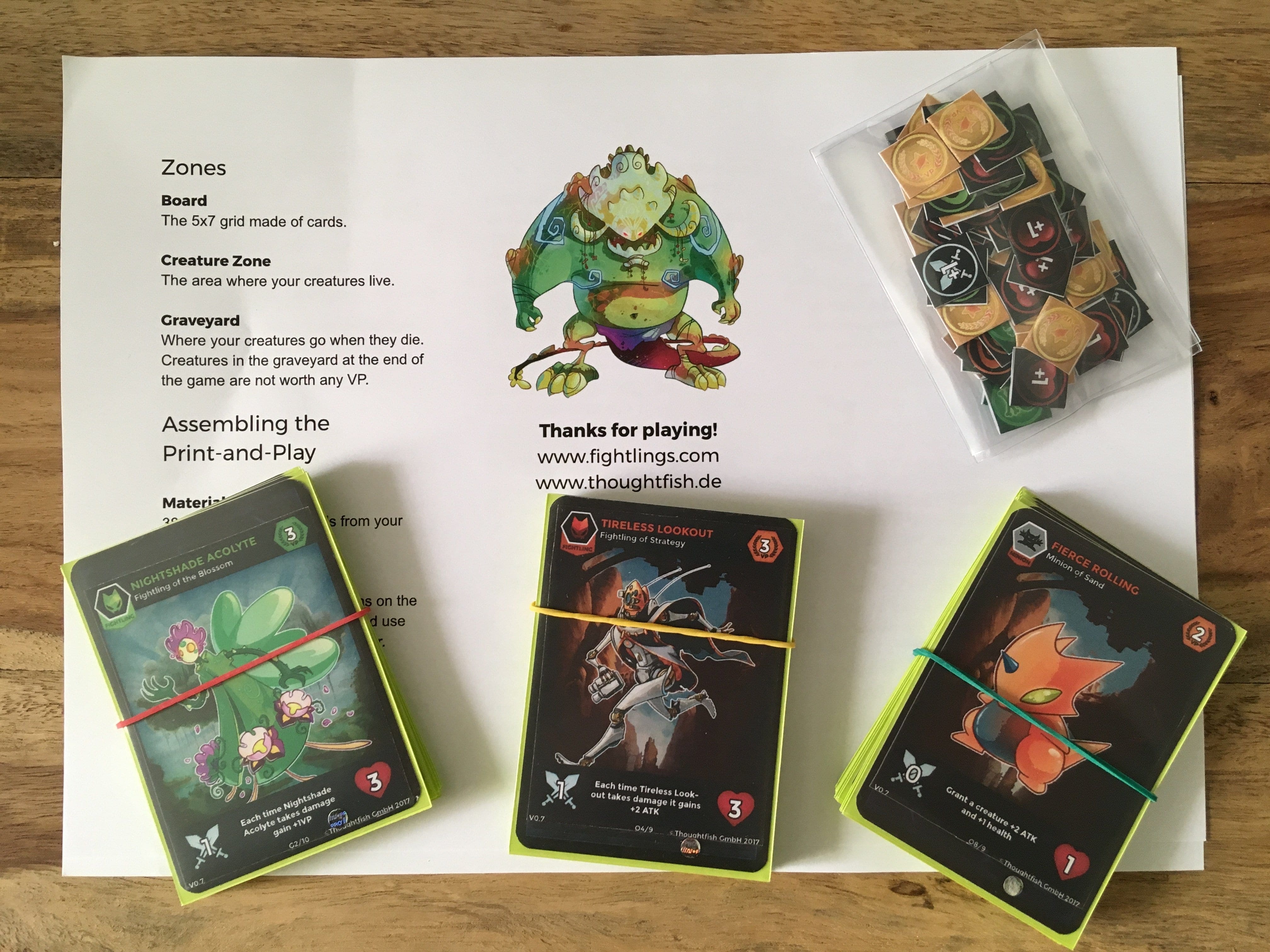 Fightlings: Das Kartenspiel plagt das typische Henne-Ei Problem, denn obwohl das grundlegende Gameplay erstmals in der mobilen App zum Einsatz gekommen ist, einen ersten analogen Prototyp gab es bereits während der Entwicklung. Mit diesem wurde das Duell-System, das generelle Balancing und die Spielmechaniken ausgiebig getestet. Die geplante Version des Kartenspiels soll aber im Hinblick auf Tempo und Spiellänge überarbeitet sowie verbessert werden und über eine mittlere Lernkurve mit einem hohen Wiederspielwert verfügen. Aber auch wenn sich die App und das Kartenspiel die Memory-Aufdeckmechanik als ihr grundlegendes Spielprinzip teilen, wird es doch einige fundamentalen Unterschiede zwischen den beiden Versionen geben. Vor allem handelt es sich bei der analogen Version um ein „Living Card Game“, welches den Spielern ermöglicht, sich ihre eigenes Deck aus allen Clans einer bestimmten Fraktion individuell zusammenzustellen. Was aber beibehalten wird, ist die künstlerische Gestaltung des Spiels, welche sich sehr stark an die App orientiert und die wundervollen, handgezeichneten Kreaturen-Designs verwendet.
