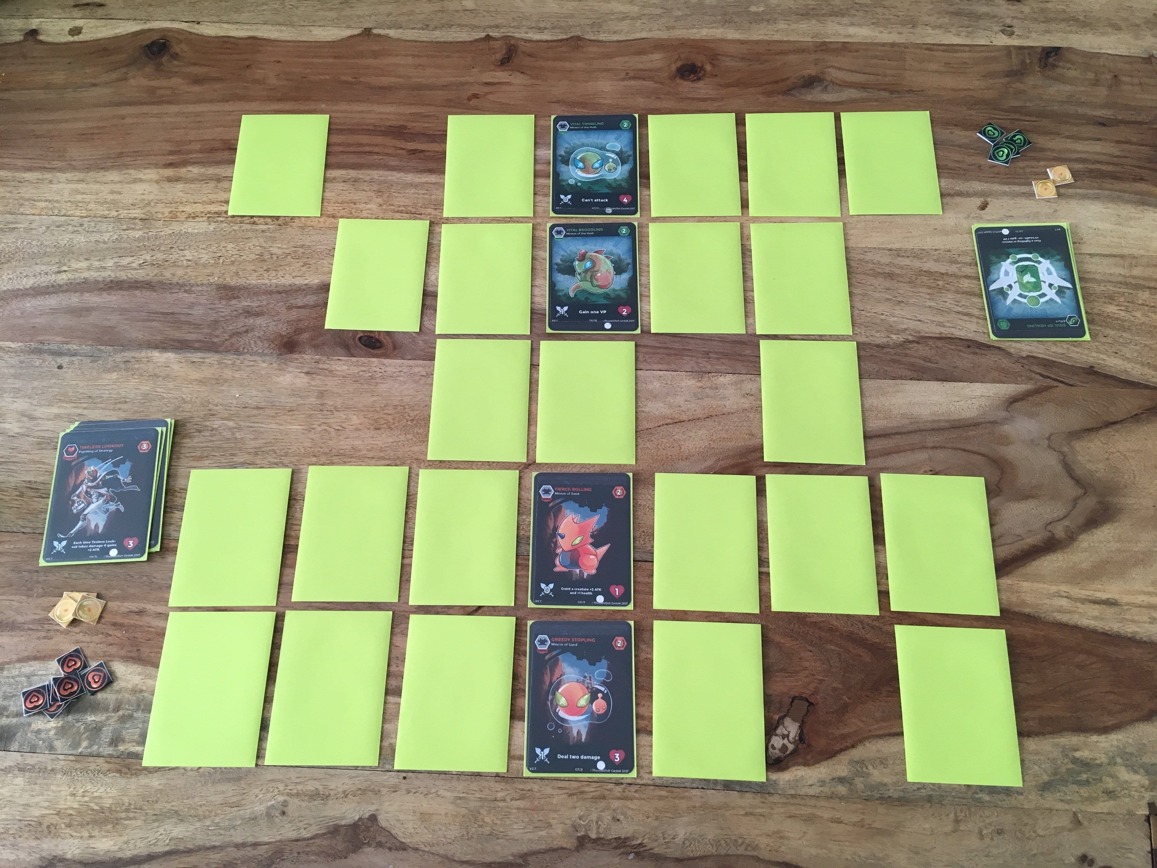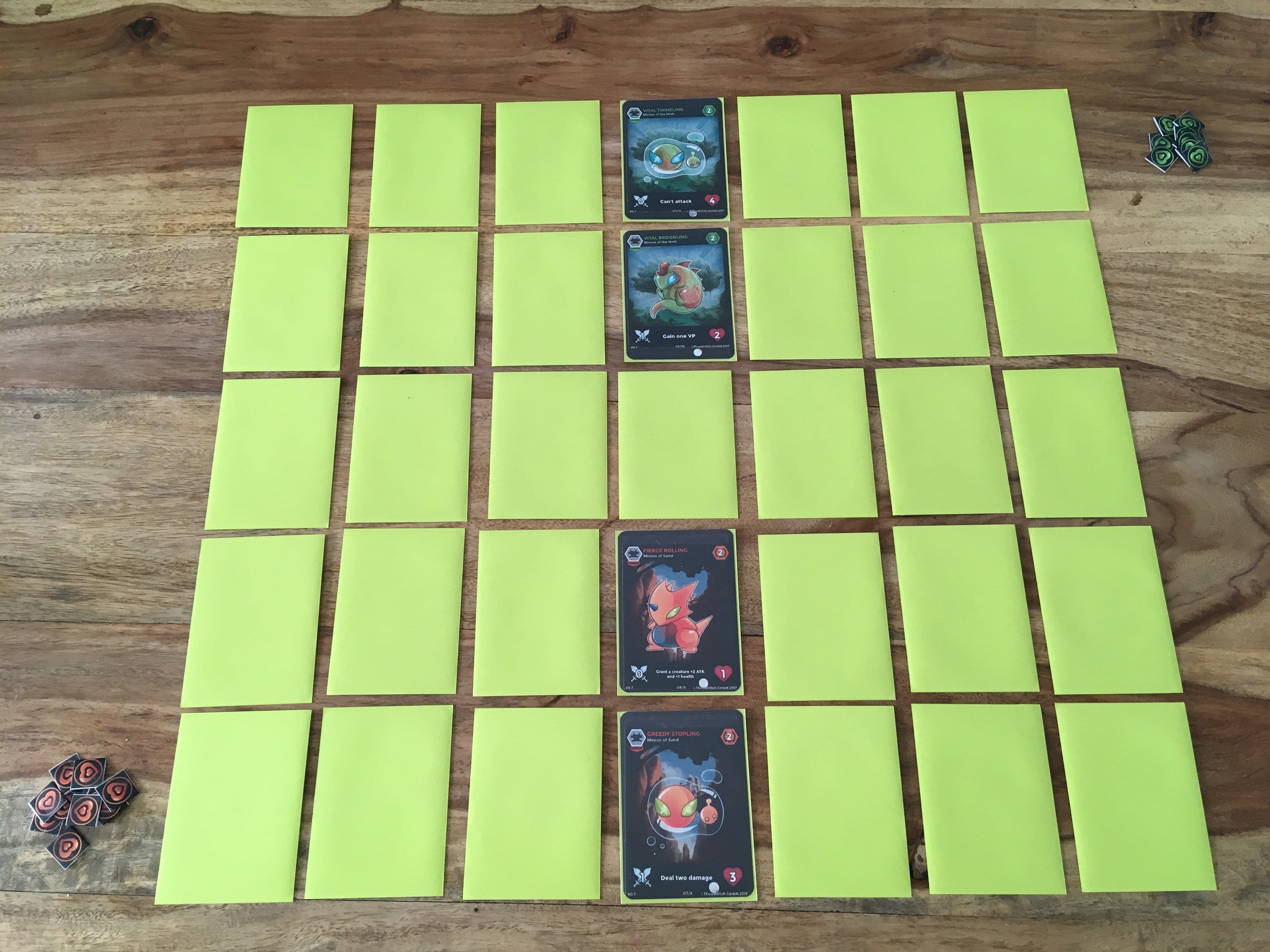 Der Prototyp, den uns Thoughtfish vorab zur Verfügung gestellt hat, beinhaltet zwei vorgegebene Decks mit jeweils 17 Karten, 5 Wild-Cards und einer handvoll Tokens, die für Lebens-, Angriffs-, Schadenspunkte, sowie Gift und Victory Points stehen. Die beiden Decks werden mit einer zufällig ausgewählten Wild-Card gemischt und in einem 5×7 Raster aufgelegt, wobei pro Fraktion jeweils zwei unterschiedliche Minion-Karten bereits aufgedeckt sind. Wie bei Kartenspielen meist üblich, unterteilt sich ein Zug in mehrere Phasen. In der Wartungsphase werden die, in der Runde zuvor einer Karte zugewiesenen Effekte, wie etwa Gift-Angriffe, ausgeführt und der Ausgangszustand wieder hergestellt. Die Kampfphase beginnt mit dem Ausrufen der Angreifer und der Blocker. Das sind Karten sich aufgrund des Aufdeckens bereits in der Creature-Zone, also außerhalb des Spielfeldes befinden. Beendet wird dieser Spielabschnitt durch den Angriff auf die gegnerischen Karten und Lebenspunkte. Die dritte Phase dient zum Aufdecken der Karten, bei dem immer drei Karten umgedreht werden. Findet man ein passendes Pärchen, werden einerseits die entsprechenden Effekte sofort ausgeführt, andererseits kommen die Karten in die Creature-Zone des Besitzers – nicht in die des Aufdeckers. Effekt- und Wild-Cards kommen auf den Friedhof.