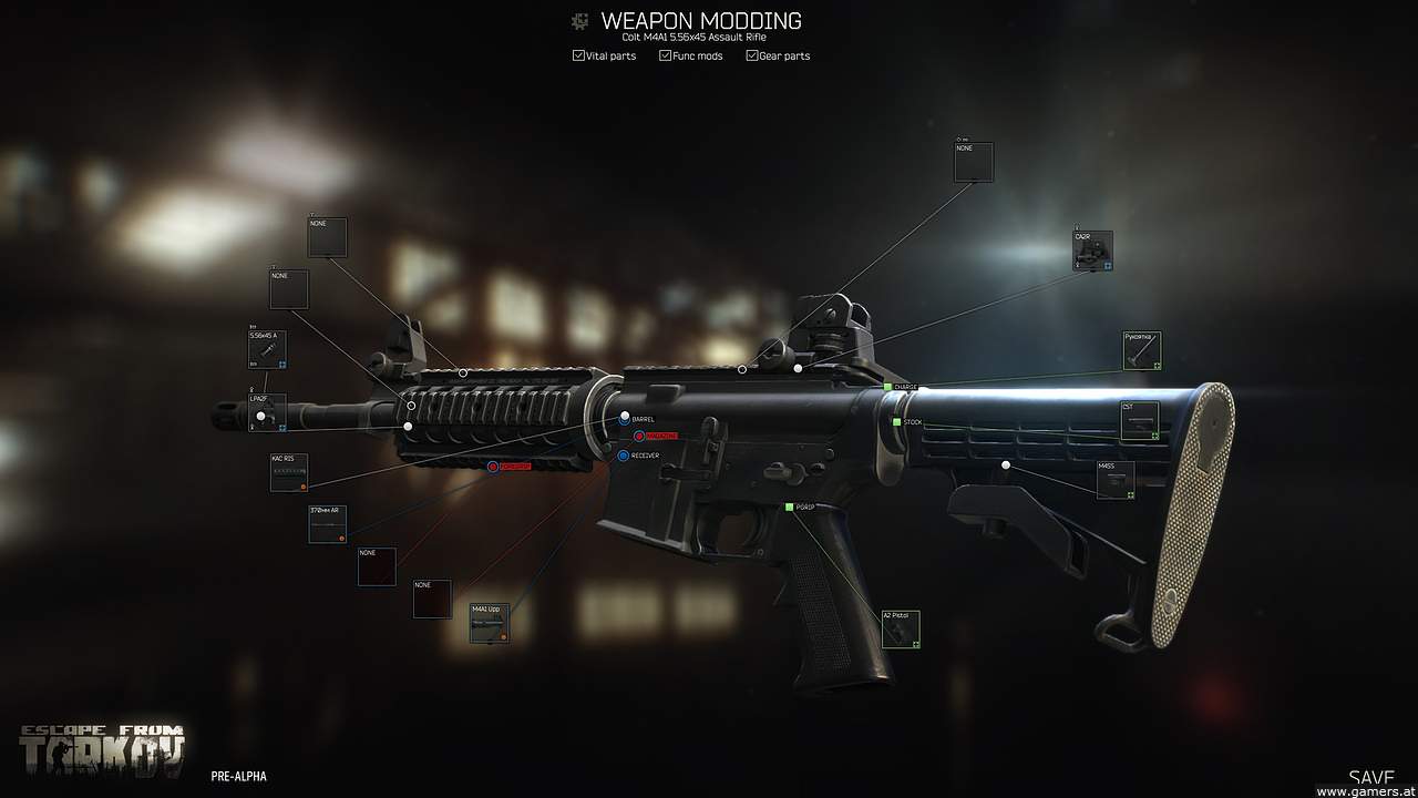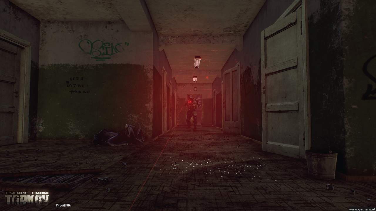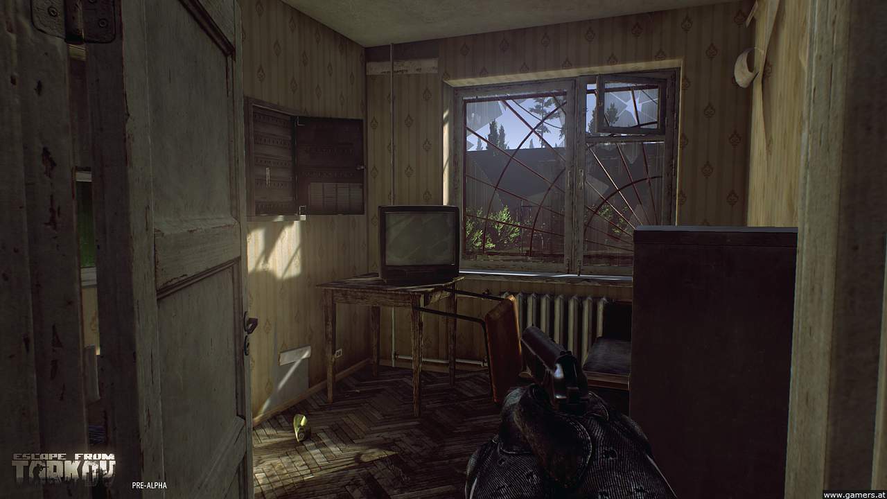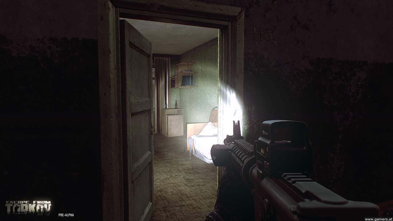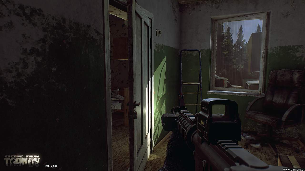 Diese zeigen neue detaillierte Aufnahmen der Umgebung, die bereits aus früheren Screenshots bekannt ist – die Wohnheime einer Fabrik am Stadtrand von Tarkov. Außerdem können die Spieler hier erstmals einen Blick auf das Charakter-Inventar und das Waffenanpassungsmenü werfen.