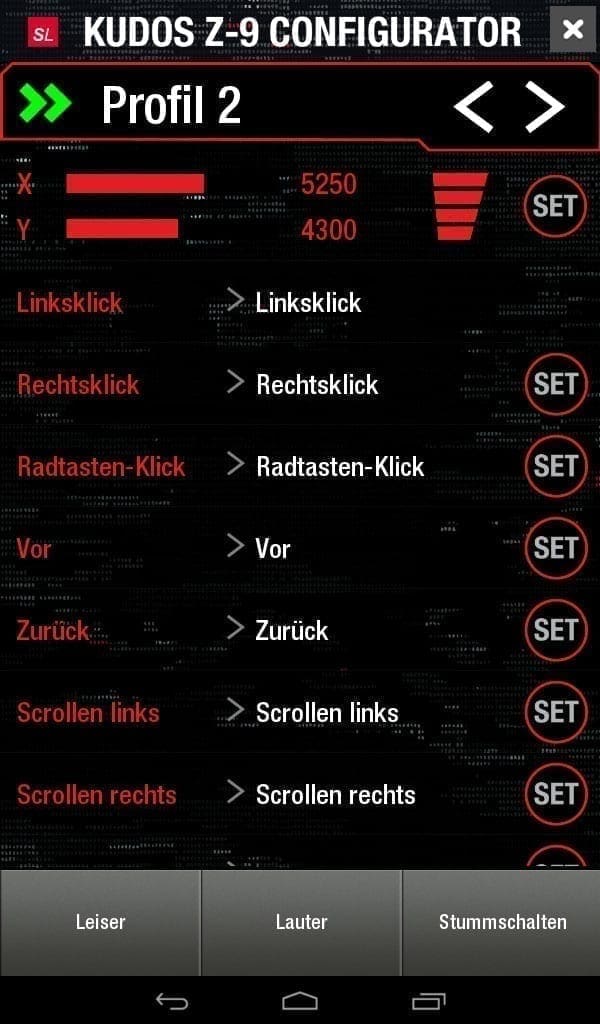 Dank kostenloser App (ab Android 4 und iOS 7) können sämtliche Einstellungen über die Konfigurations-App während des laufenden Spiels vorgenommen werden. Durch diese innovative Konfigurationszentrale gehören Spielunterbrechungen der Vergangenheit an und umfangreiche Makros können on-the-fly aufgenommen oder Profile bequem durchgewechselt werden. Dadurch lässt sich die Hardware jederzeit an die Bedürfnisse des Spielers oder die jeweilige Spielsituation anpassen. Smartphone oder Tablet und der PC mit der KUDOS Z-9 müssen sich dabei lediglich im selben Netzwerk befinden und zu Beginn via Code miteinander verbunden werden.