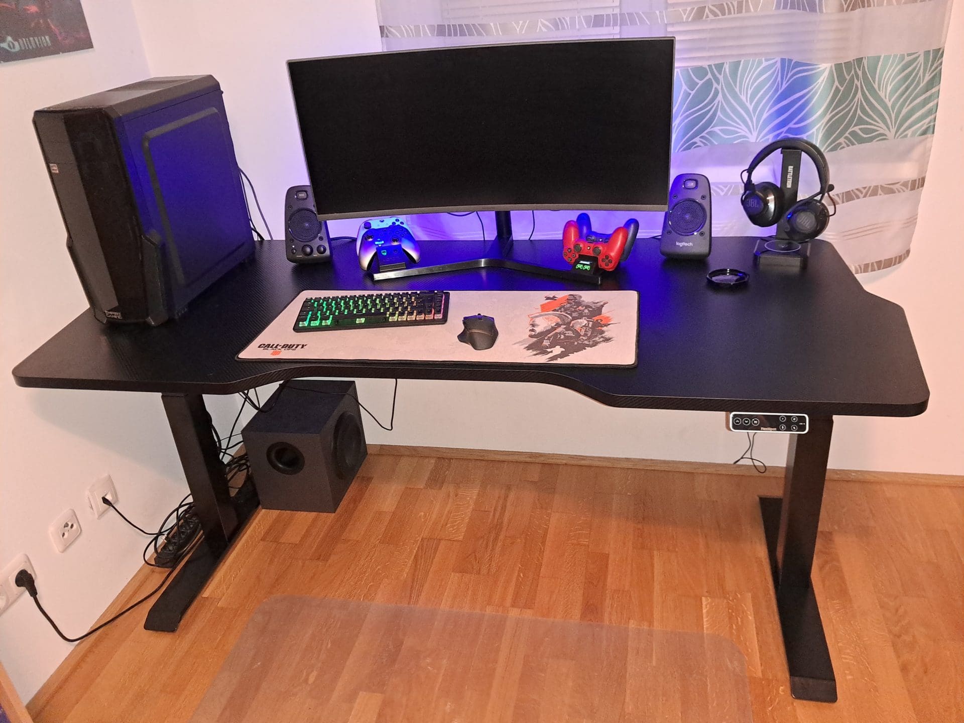 Wenn ihr den Tisch maximal ausfahrt, müsst ihr jedoch auf eines achten – die Verkabelung muss ebenfalls lange genug sein. Ich hatte bisher immer den Spielerechner neben bzw. unter dem Tisch platziert. Wenn ihr nun den Tisch voll in die Höhe fahren lässt, können die Kabeln vom Computer zur Peripherie am Tisch (Monitor, Lautsprecher, Maus, Tastatur usw.) schnell zu kurz sein. Und der Tisch stoppt nicht (unbedingt) für ein kleines Kabel, was zu einer Beschädigung des Kabels und vor allem auch der Buchsen am Computer (oder der Peripherie, wenn die plötzlich durch die Gegend fliegt) führen kann. Ihr solltet also unbedingt vorher vorsichtig testen, ob alle Kabel lange genug sind. In meinem Fall war das nicht der Fall, also habe ich mich entschlossen, den PC erstmals in meiner Gaming-Karriere direkt am Tisch zu platzieren. Somit ist das Problem mit den Kabeln entschärft, und außerdem kann ich den PC so in seiner vollen Pracht bestaunen. Wofür habe ich denn die ganzen LED-Lüfter eingebaut? Außerdem ist es oben am Tisch weniger staubig als am Fußboden, und die Luftzirkulation ist ebenfalls besser als am Boden in der Zimmerecke, was für die Kühlung ein nicht zu unterschätzender Vorteil ist. Allerdings laufen dennoch einige Kabeln noch vom PC nach unten, nämlich einerseits das Netzwerkkabel, als auch den Stromkabeln von PC und Monitor. Auch den riesigen Subwoofer habe ich am Boden belassen. Hier müsst ihr euch vergewissern, dass die ganze Verkabelung bei allen von euch verwendeten Tischhöhen passt.