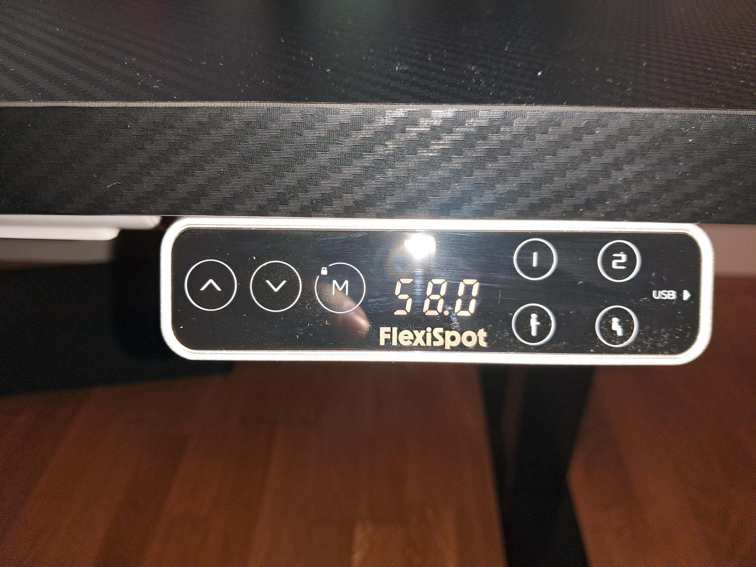 Die Höhe kann zwischen 58 cm (Kindertisch) stufenlos auf bis zu 1,23 m angepasst werden. Der Motor funktioniert leise und habt bzw. senkt die Tischplatte zügig. Der Tisch ist überaus stabil, allerdings nimmt die Stabilität mit zunehmender Höhe natürlich leicht ab. Während der auf der niedrigsten Einstellung felsenfest dasteht, ist er voll ausgefahren natürlich ein wenig anfälliger gegen direkte Stöße. Wirklich ins Wackeln bringen könnt ihr in allerdings auch bei 1,23 m nicht. Die Tischplatte ist groß. So richtig groß. Mit fast 1,80 m Länge und 80 cm Breite geht sich darauf wirklich alles aus, was ich zum Spielen brauche. Der große Ultrawide-Monitor, die Lautsprecher, die Gamepads in ihren Ladestationen, der Kopfhörerständer. Ein riesiges Mauspad, und sogar der Spiele-PC selbst kann nun direkt am Tisch stehen. Auch Arbeitsunterlagen liegen nicht andauernd störend im Weg, sondern können in Ruhe auf die Seite geschoben werden. Und es bleibt immer noch genug Platz für meine Füße. Die rund 2,5 cm dicke Tischplatte besteht aus edler Karbonfaser, die einiges aushalten sollte und es auch erlaubt, Monitorhalterungen problemlos anzuschrauben. Die Steuerungskonsole an der Vorderseite enthält auch eine USB-Ladebuchse (1.0A), was sich als sehr nützlich erwiesen hat.