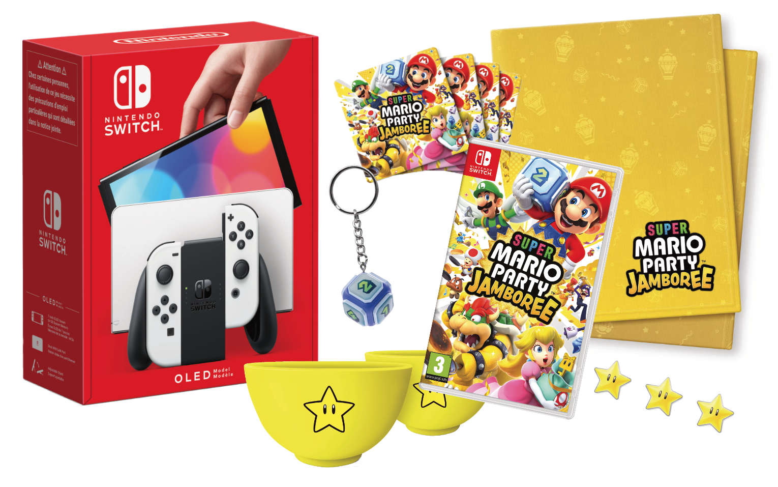 - 1x Nintendo Switch OLED (weiß) + Super Mario Party Jamboree + Party Paket (bestehend aus Decke, Schüssel, Partyhut, Flaggen, Untersetzer und Girlande)
