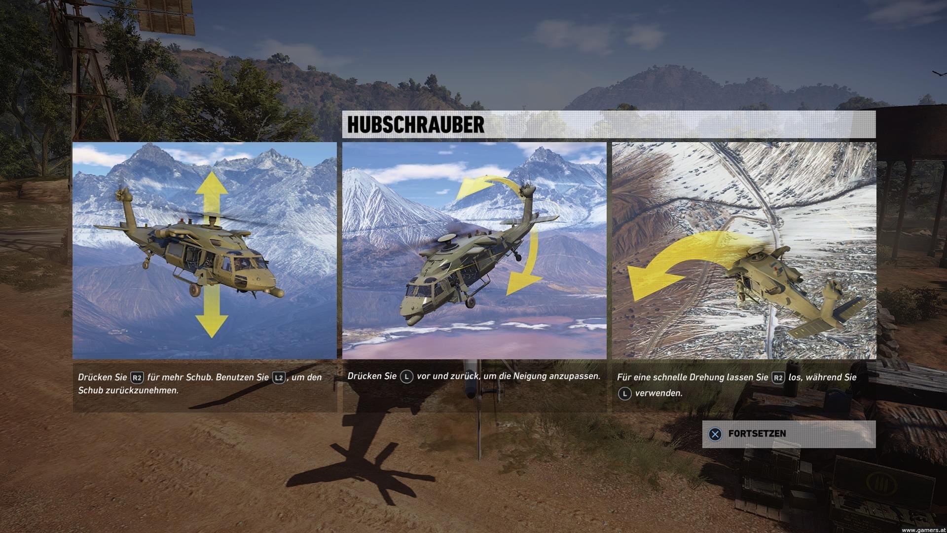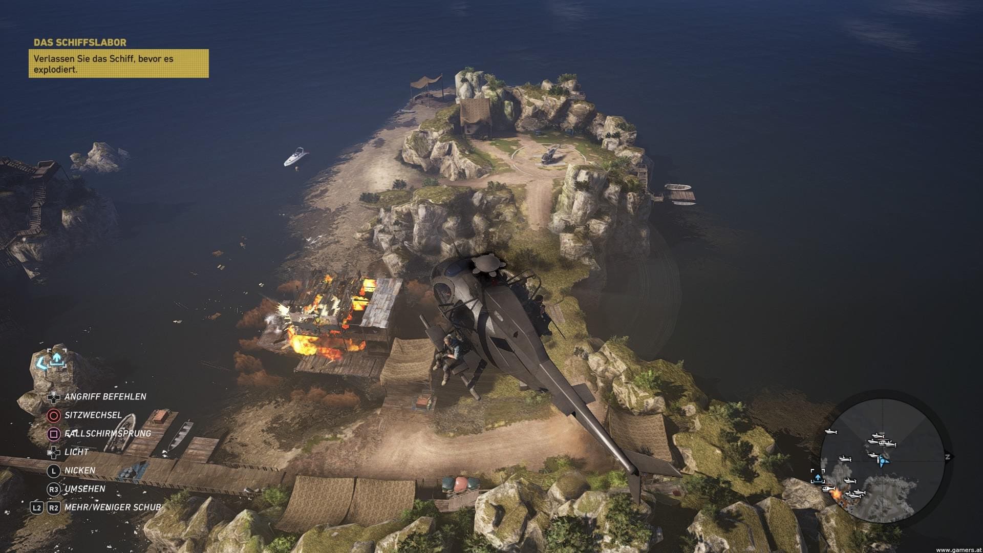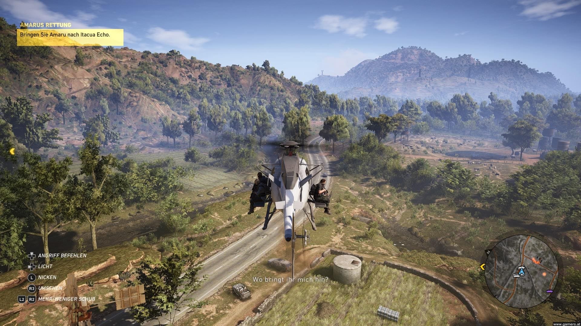 Die ersten Missionen im Spiel machen uns mit der Mechanik und den Möglichkeiten des Gameplays vertraut. Es werden so immer wieder Tutorialschirme eingeblendet die uns mit den wichtigsten Techniken und auch der Steuerung der Fahrzeuge vertraut machen. Apropos Fahrzeuge und Fortbewegungsmittel im Spiel, davon gibt es reichlich, was bei der enormen Größe der angebotene Landschaft auch dringend nötig ist. Da kommt man auf Schusters Rappen nicht weit und kann so auf zahlreiche Autotypen, LKW,s, Motorräder oder Boote zurückgreifen. Wer besonders schnell zum Einsatzziel gelangen möchte schnappt sich am besten einen Helikopter, im besten Fall einen Kampfhubschrauber, lässt sein Team Platz nehmen und ab geht der wilde Ritt über die weitläufige Landschaft Boliviens. Anfangs kämpft man noch etwas mit der sensiblen Steuerung von Helikopter oder Flugzeug, nach einigen harten Landungen hat man aber dann den Dreh heraussen.