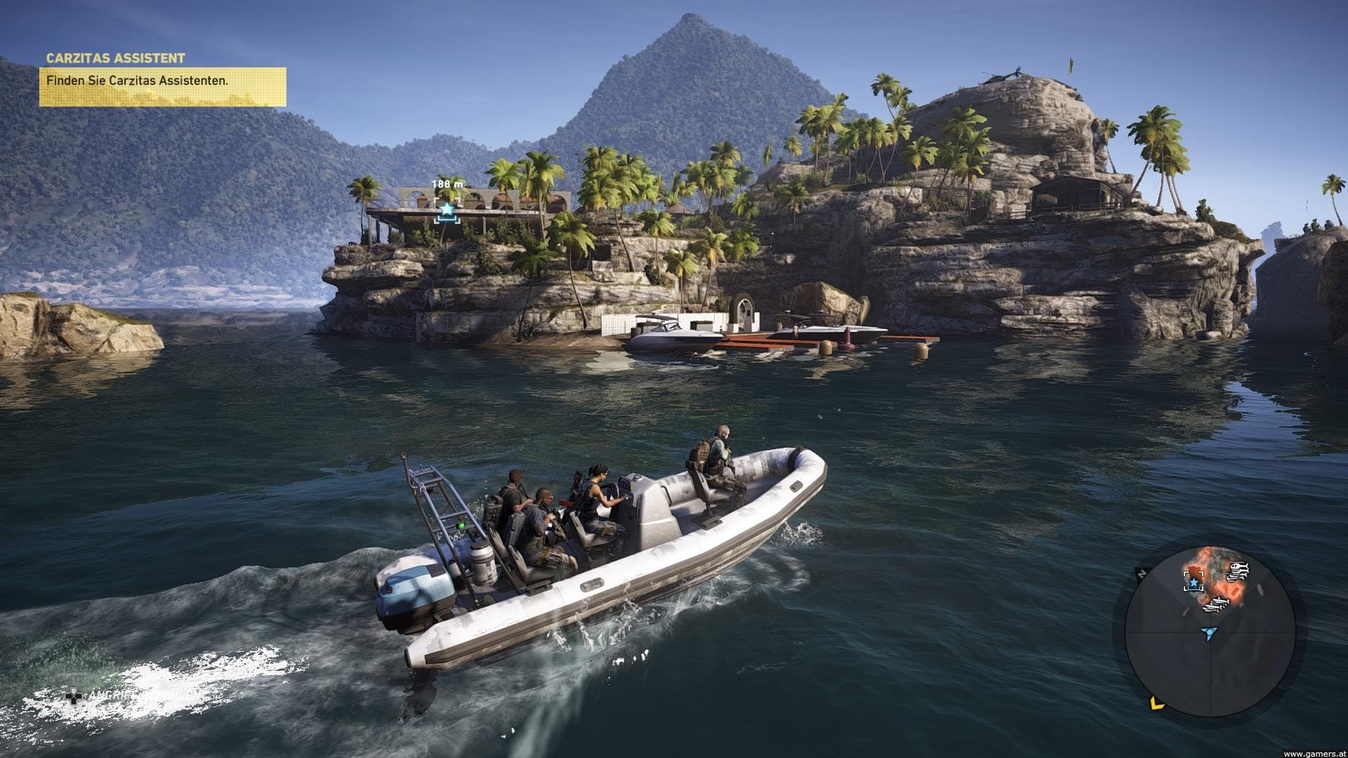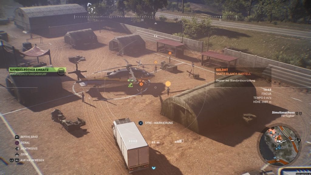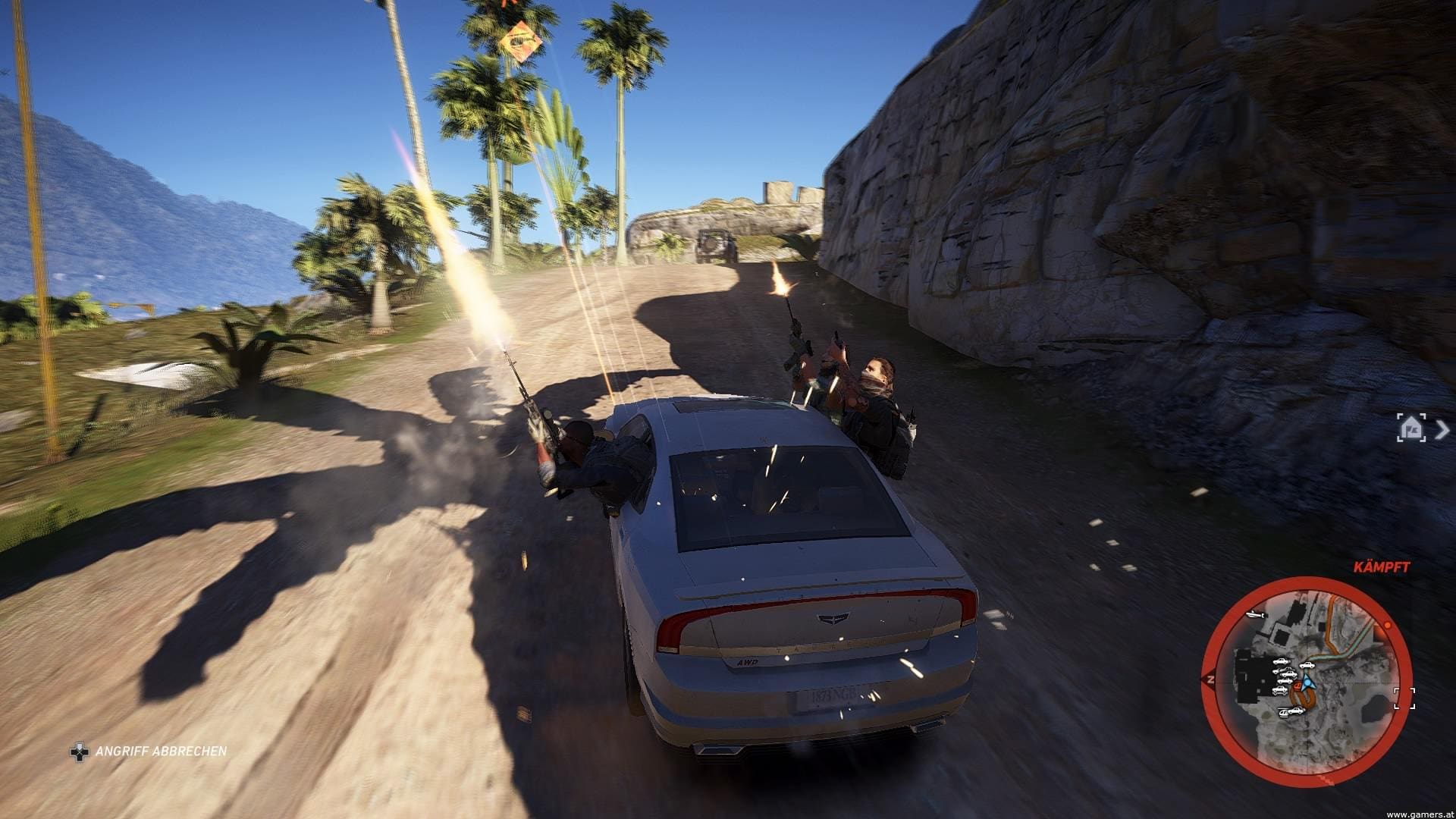 Die ersten Missionen im Spiel machen uns mit der Mechanik und den Möglichkeiten des Gameplays vertraut. Es werden so immer wieder Tutorialschirme eingeblendet die uns mit den wichtigsten Techniken und auch der Steuerung der Fahrzeuge vertraut machen. Apropos Fahrzeuge und Fortbewegungsmittel im Spiel, davon gibt es reichlich, was bei der enormen Größe der angebotene Landschaft auch dringend nötig ist. Da kommt man auf Schusters Rappen nicht weit und kann so auf zahlreiche Autotypen, LKW,s, Motorräder oder Boote zurückgreifen. Wer besonders schnell zum Einsatzziel gelangen möchte schnappt sich am besten einen Helikopter, im besten Fall einen Kampfhubschrauber, lässt sein Team Platz nehmen und ab geht der wilde Ritt über die weitläufige Landschaft Boliviens. Anfangs kämpft man noch etwas mit der sensiblen Steuerung von Helikopter oder Flugzeug, nach einigen harten Landungen hat man aber dann den Dreh heraussen.