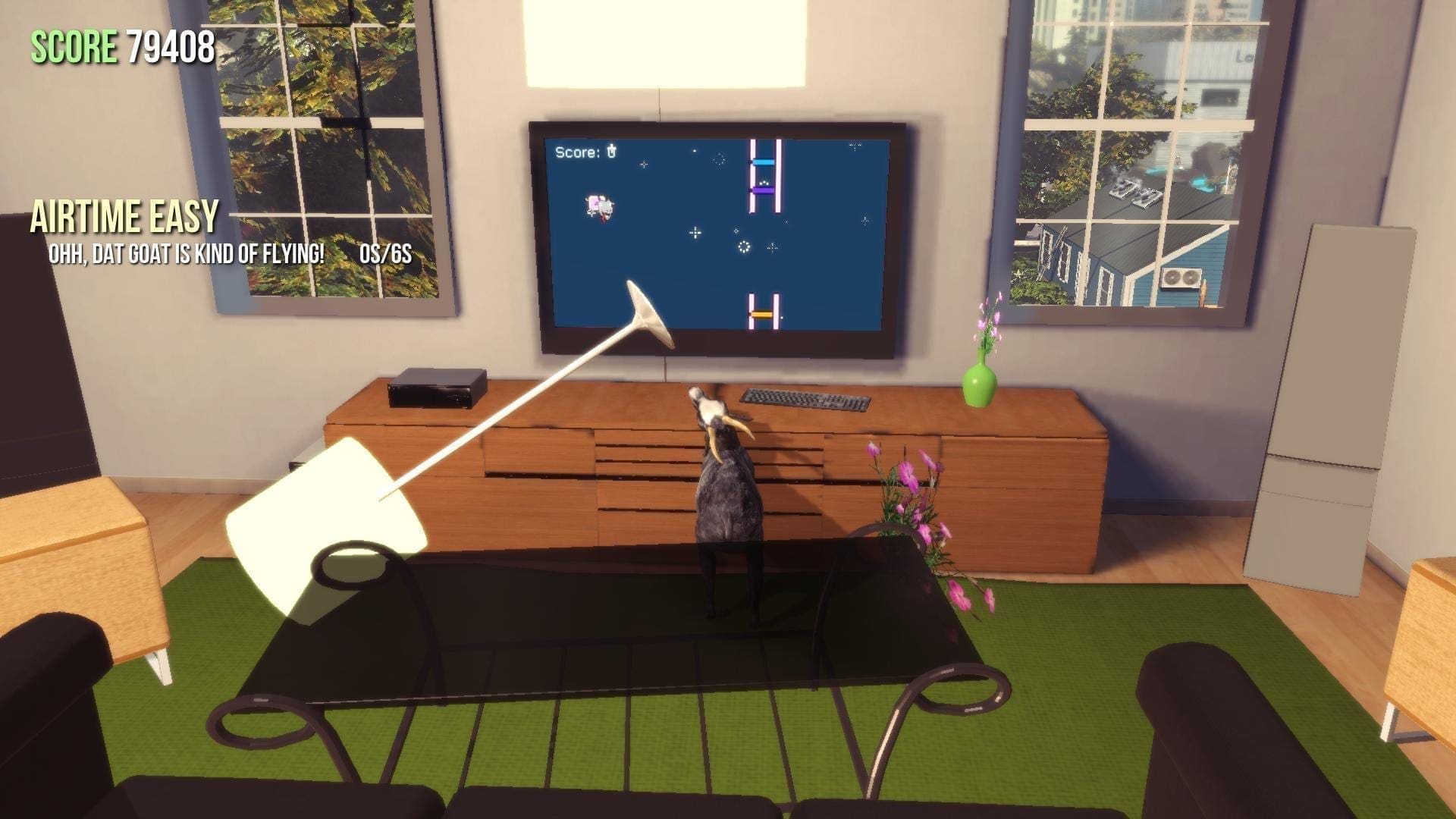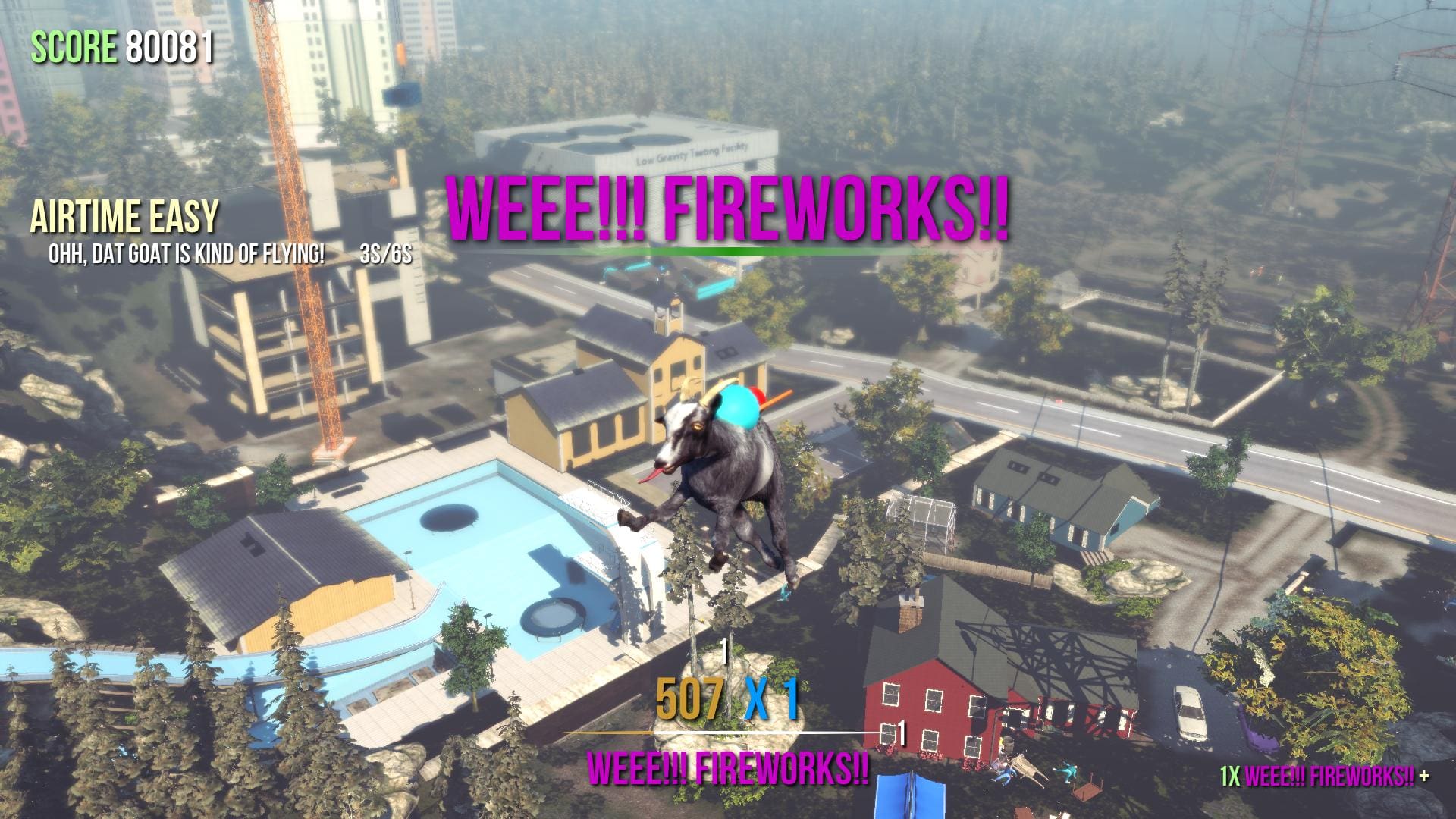 Zudem gibt es zahlreiche weitere „Events“ und Easter Eggs zu entdecken. Oftmals begleitet von witzigen Achievements wie „A Goat among Legends“, wenn man die Entwickler findet, die ihr Büro quasi ins Spiel übertragen haben, oder „Michael Bay“, wenn man einfach nur für genug Explosionen und Verwüstung gesorgt hat. Damit diese Verwüstung übrigens physikalisch korrekt abläuft und dabei auch noch gut aussieht, wurde die Unreal Engine für das Game herangezogen. Das Ergebnis ist natürlich alles andere als „bahnbrechend“, es aber nur zweckmäßig zu nennen, wäre fast etwas gemein. Jedenfalls halten sich dadurch auch die Anforderungen in Grenzen, auch wenn hier vermutlich noch eine Menge Optimierung drin gewesen wäre. Aber ich darf mich wiederholen: Um spießige Kleinigkeiten wie technische Ausgereiftheit geht es hier nicht! Es geht darum komplett abstrusen und sinnbefreiten Spaß zu haben. Und das schafft der Goat Simulator. Und das, was die Entwickler einem dafür zur Verfügung stellen, ist noch lange nicht das Ende der Fahnenstange, darf doch auch die Community fleißig Mods und Erweiterungen basteln – was sie auch schon getan hat.