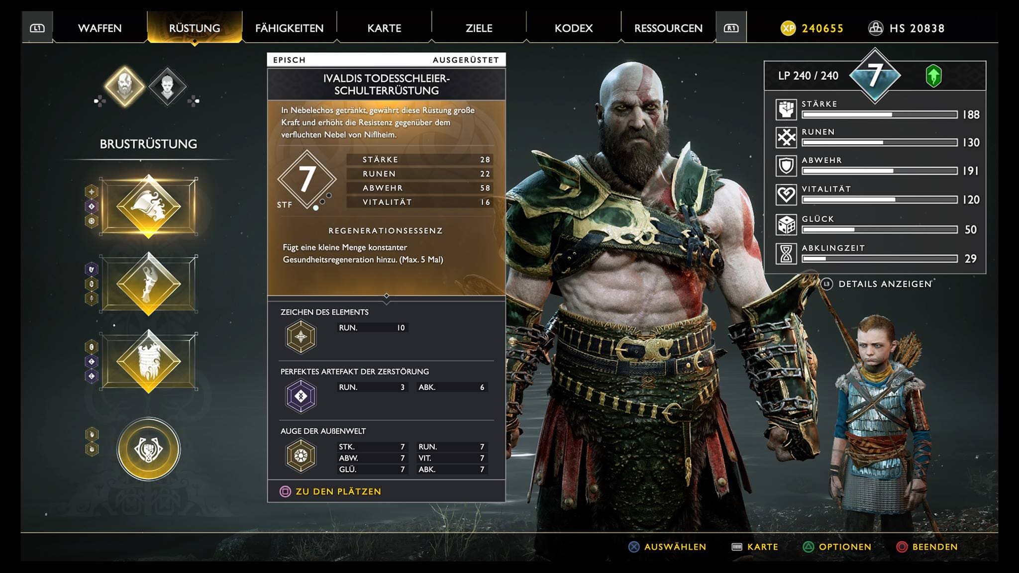 Auch ein Loot-System feiert in God of War seinen Einstand in der Serie. Gegner und Truhen droppen gelegentlich Rüstungsteile. Diese gibt es in verschiedenen Seltenheitsgraden und lassen sich von dem äußerst amüsanten Zwergenduo Brok und Sindri verbessern. Damit die beiden Schmiedemeister loslegen können, werden natürlich die richtigen Materialien benötigt. Ähnlich wie in Destiny steigt Kratos Level mit der Qualität der Ausrüstung. Dies wird gerade im späteren Spielverlauf bzw. nach der Kampagne wichtig, denn dann winken die Walküren. Diese optionalen Bosskämpfe sind sehr fordernd und erreichen das Schwierigkeitsniveau eines Dark Souls. Sollte man auch nur irgendwie den Hauch einer Chance haben wollen, benötigt man die beste Ausrüstung. Doch kein Grund zum verzweifeln, denn Rüstung und Waffe lassen sich mit diversen Accessoires verbessern. Dadurch bekommt man noch den einen, oder anderen praktischen Boost verliehen. Da sich diese praktischen Anhängsel auch noch verbessern lassen, braucht es dann nur noch Geduld und Skill um die Walküren erfolgreich zu rupfen.