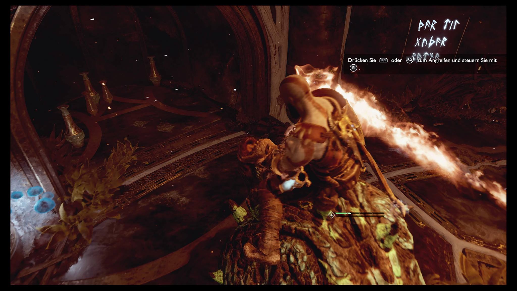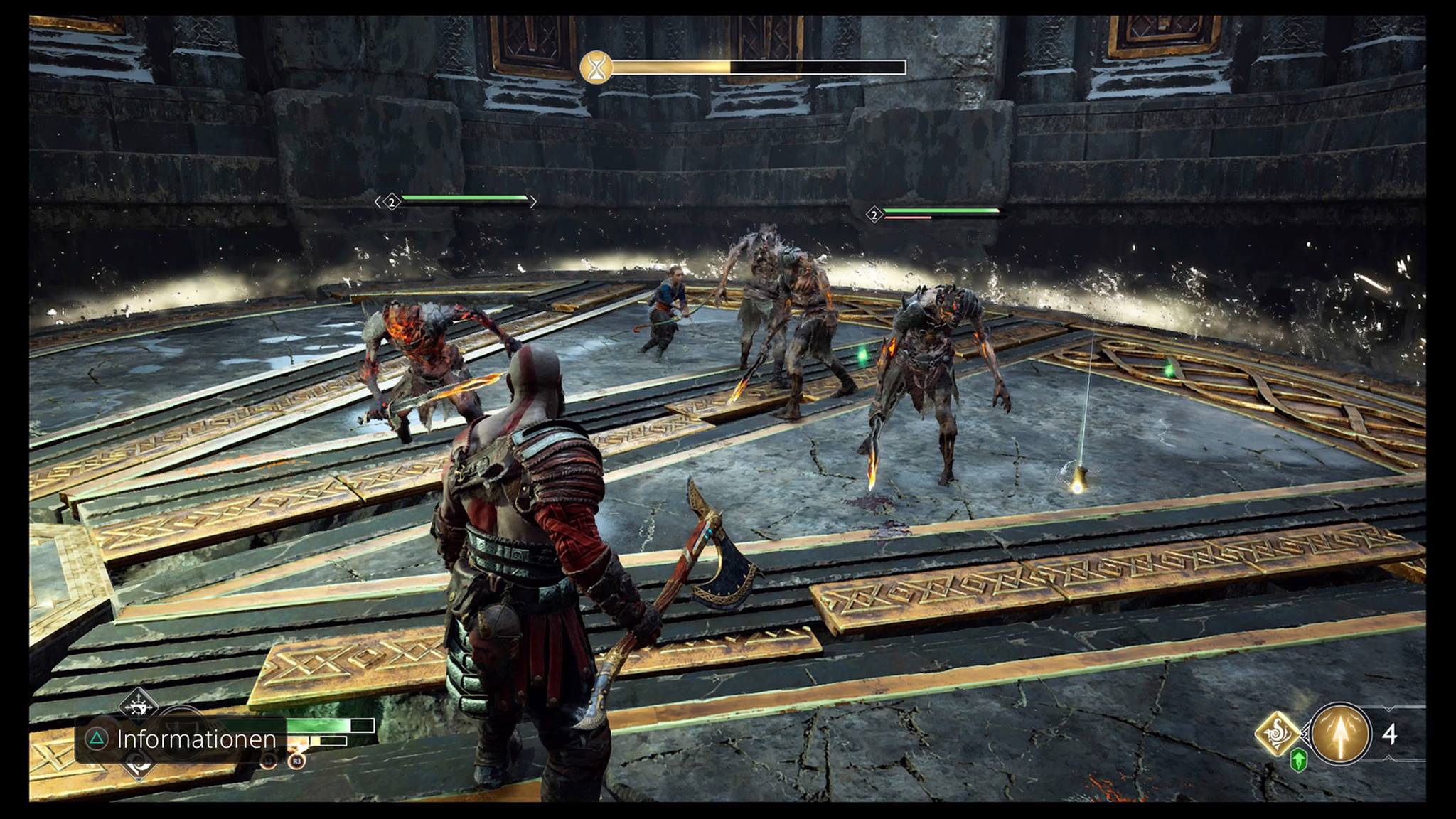 Ein wichtiger Faktor im Kampf ist übrigens Atreus. Dieser feuert bei Benutzung der Vierecktaste magische Pfeile ab. Je nach ausgewählten Zauber, können die Projektile Gegner ablenken, elektrifizieren, oder betäuben. Betäubte Gegner ereilt dabei ein ungemütliches Schicksal, denn sie werden Opfer von gnadenlosen Finishern. Die Gewalteinlagen triefen zwar nicht mehr literweise vor Blut, wie noch in God of War 3, sind aber immer noch nichts für schwache Mägen.