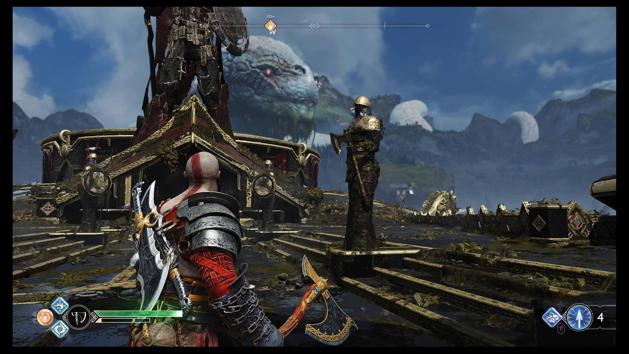 Statt den Chaosklingen schwingen wir diesmal die Leviathanaxt und ein neues Schild gibt uns nun auch die Möglichkeit der Defensive. Dies ist auch recht oft nötig. God of War kommt nämlich mit einem – für ein Mainstreamspiel – sehr knackigen Schwierigkeitsgrad daher. Das Kampfsystem lässt sich am ehesten mit dem aus Assassins Creed Origins vergleichen – fühlt sich jedoch, aufgrund der Zahlreichen Moves, um einiges dynamischer an. Mit der R1 und R2 Taste lassen wir diverse Kombos auf unsere Widersacher herab regnen. Mit L1 blocken und kontern wir gegnerische Angriffe. Natürlich lassen sich im Verlauf der Kampagne von God of War, durch erarbeitete Erfahrungspunkte, ein Haufen neuer Moves freischalten. So ist man später in der Lage Fernkampfgeschosse mit dem Schild zu kontern und zurück an den Absender zu schicken. Als sehr cooles Feature empfand ich die Möglichkeit die Leviathanaxt zu werfen und diese auf Befehl – wie einen Boomerang – wieder retour kommen zu lassen. Durch die Kombination dieser einzelnen Elemente entsteht ein sehr toller Flow aus Kampf und Verteidigung, welcher – trotz mehrerer Gegner am Schirm – selten in Chaos ausartet.