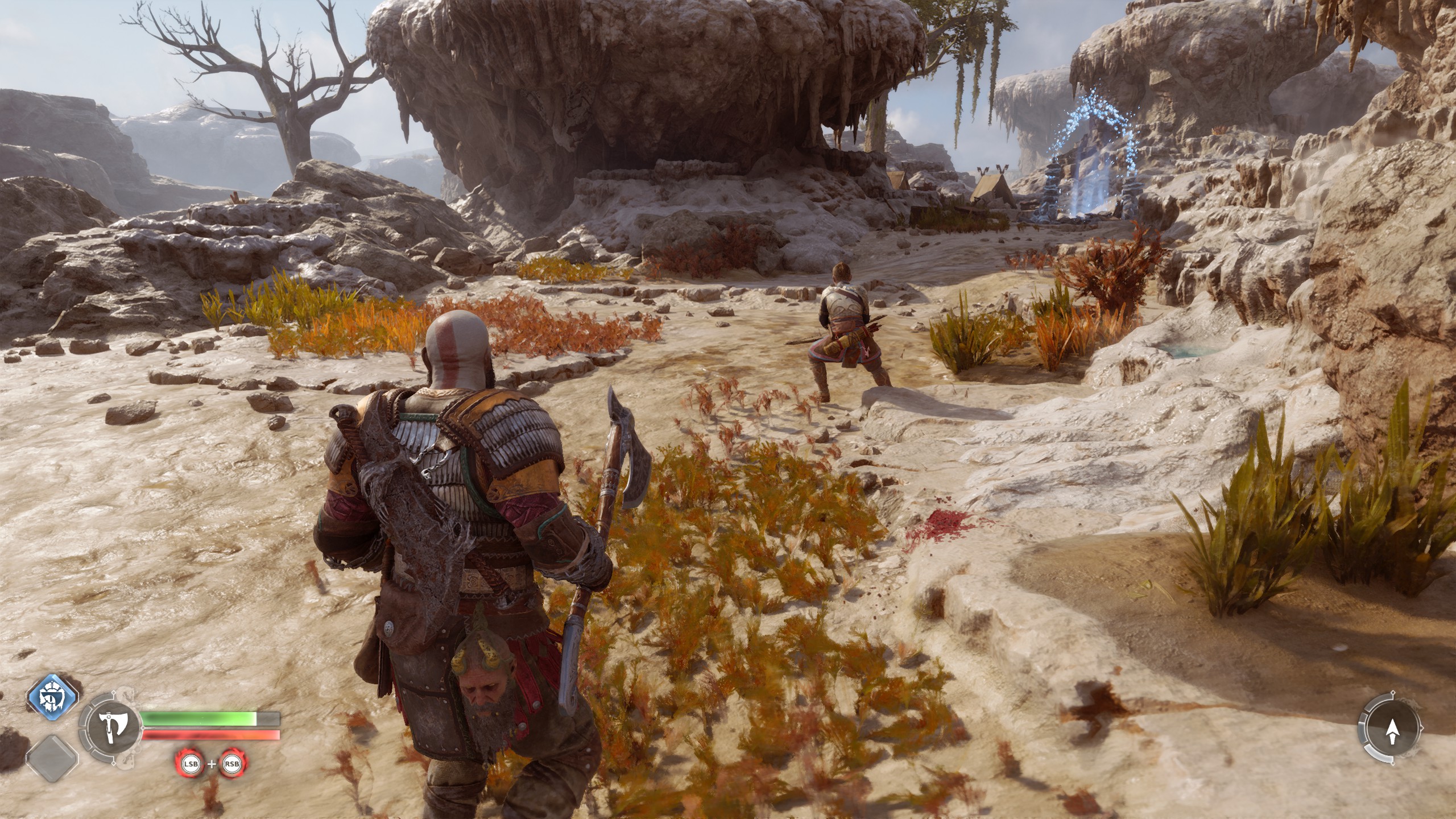 Ihr steuert Kratos aus der Schulteransicht. Kratos kann mit seiner (eisigen) Axt zuschlagen (langsam/schnell), mit dem Schild blocken oder die Axt werfen (und danach wieder zurück pfeifen). Manche Gegner bekämpft er besser mit seinen (feurigen) Schwertern, mit denen er auch große Objekte bewegen kann. Er bringt sich mit schnellen Ausweichrollen aus der Gefahrenzone und weist seinen Sohn an, mit dem Bogen auf einzelne Feinde zu schießen. Wenn er gerade nicht kämpft, erkundet er die Gegend und findet, meistens in etwas abseits des Hauptpfades liegenden Bereichen, Ressourcen für spätere Upgrades seiner Ausrüstung. So schön die Level auch gestaltet sind – grafisch kann man echt nicht meckern – so sind doch viele Umgebungen recht linear. Ihr bewegt auch entlang des vorgesehen Pfades, genießt immer wieder mehr oder weniger lange Zwischensequenzen, bekämpft Gegner, findet Ressourcen. Ihr verbessert die Rüstung, verbessert die Leviathan Axt von Kratos, seine Schwerter oder sein Schild, den Bogen von Atreus und lernt außerdem eine ganze Menge an verschiedenen neuen Fähigkeiten.