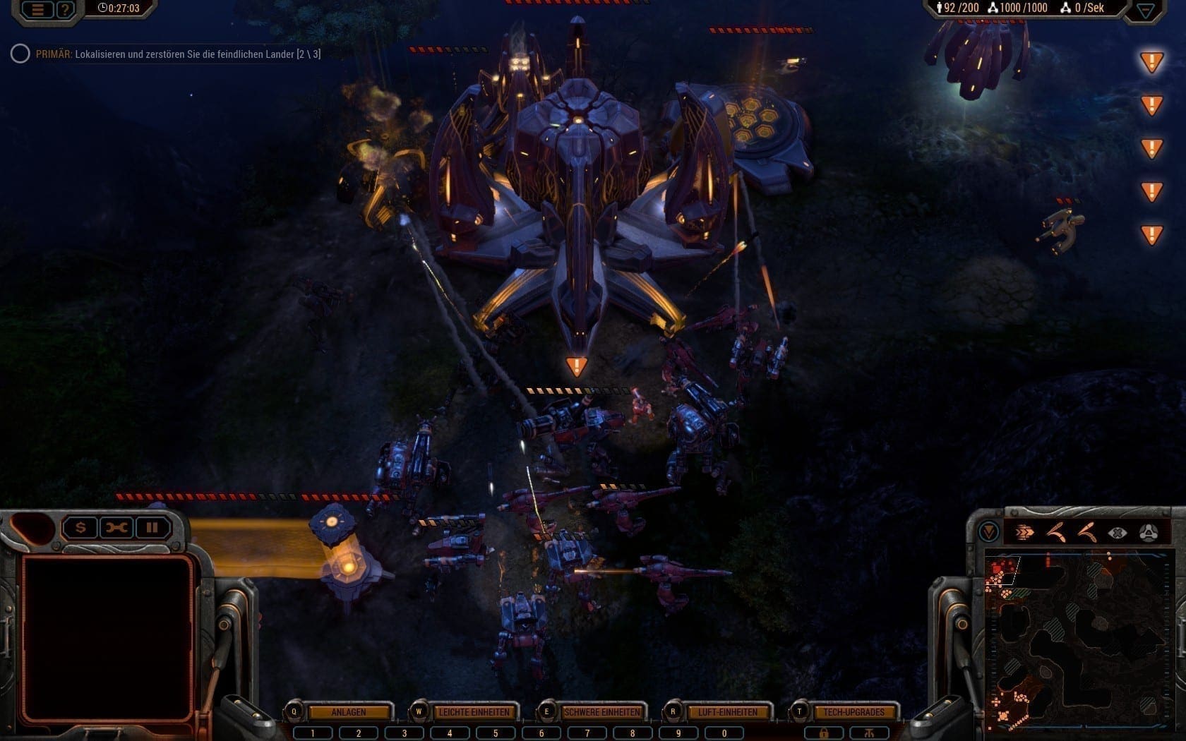 Auf Mikromanagement wird weitgehend verzichtet. Zwar gibt es für jede Fraktion eine epische Super-Einheit, aber selbst diese verfügt über keinerlei Spezialfähigkeiten sondern nur über viel Feuerkraft und große Schadensresistenz. Weiters kann in fünf unterschiedlichen Technologie-Kategorien eines von drei Upgrades erforscht werden, was jedoch spielerisch nur wenig Mehrwert mit sich bringt. Überhaupt sind die taktischen Möglichkeiten etwas eingeschränkt. Der Verzicht auf Heldenfiguren oder Erfahrungsstufen wäre noch verkraftbar, aber das Fehlen von Formationen schmerzt den virtuellen Feldherren dann doch etwas mehr. Okay, man kann Tarn-Technologie erforschen oder sich im Dickicht verstecken und den Feind in einen Hinterhalt locken, aber meist reicht es aus, eine gut ausgewogene Truppe an verschiedenen Einheiten – aber vor allem in hoher Anzahl – in die Schlacht zu schicken. Auch weicht die anfängliche Freude über die sehr unterschiedlichen Fraktionen sehr schnell einer gewissen Ernüchterung. Diese differenzieren sich hauptsächlich in der Errichtung der Basis, die Scharmützel lassen aufgrund der sehr ähnlichen Einheitentypen kaum taktische Variationen zu. Auch die Kampagne enttäuscht. Zwar wird die Hintergrundstory in aufwendigen und schönen Rendersequenzen erzählt, aber es fehlt an prägenden Protagonisten die die Geschichte tragen können. Auch das Missionsdesign der 15 Kapitel umfassenden Einzelspielerkampagne ist zwar abwechslungsreich, bietet aber lediglich Standardkost ohne großartige Wendungen. Nervig sind vor allem jene Aufträge, in denen man Goo-Nester ausrotten muss. Aufgrund ihrerer Mobilität verkommen solche Missionen zu einem frustrierendem Katz- und Mausspiel.