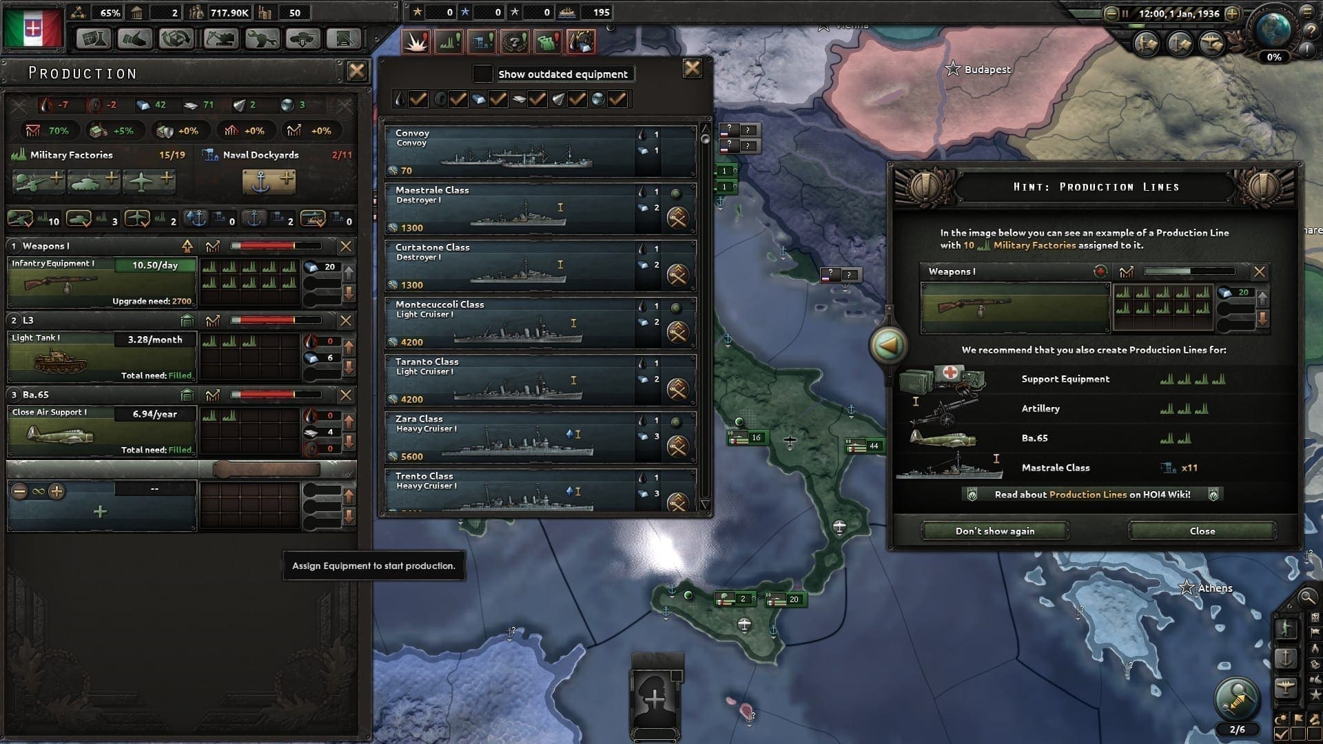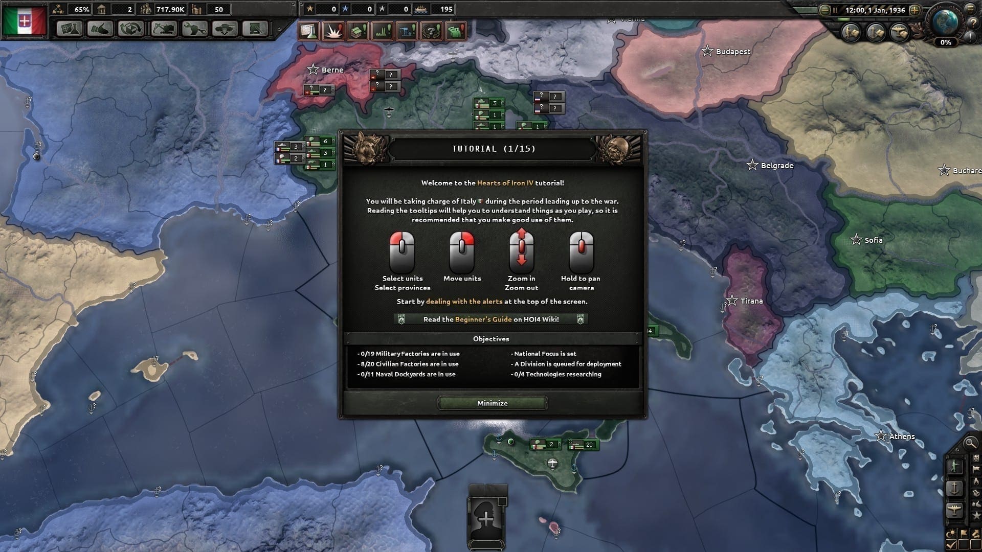 Ob das gelungen ist, darüber kann man geteilter Ansicht sein. Was aber auffällt, ist, dass es das erste Mal einen Tutorial Button gibt… dafür aber bei der Auswahl des Spielstartzeitpunktes eingeschränkt wird. Im Gegensatz zu den vielen verschiedenen Zeitszenarien aus HOI3 stehen hier nur 1936 und 1939 zur Auswahl, also vor dem Krieg und bei Kriegsbeginn. Aber kümmern wir uns erst um das Tutorial, hierbei wird einem sehr kurz und knapp anhand der Eroberung Äthiopiens durch Italien ein Teil der grundlegenden Spielmechaniken erklärt.. stets mit Verweis auf das interne Wiki . Das Tutorial ist nach knapp 10-15 Minuten auch schon wieder vorbei und lässt den Spieler mehr oder weniger aufgeklärt im Vorfeld des Krieges stehen.