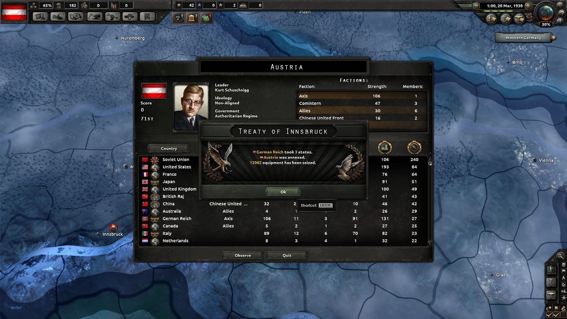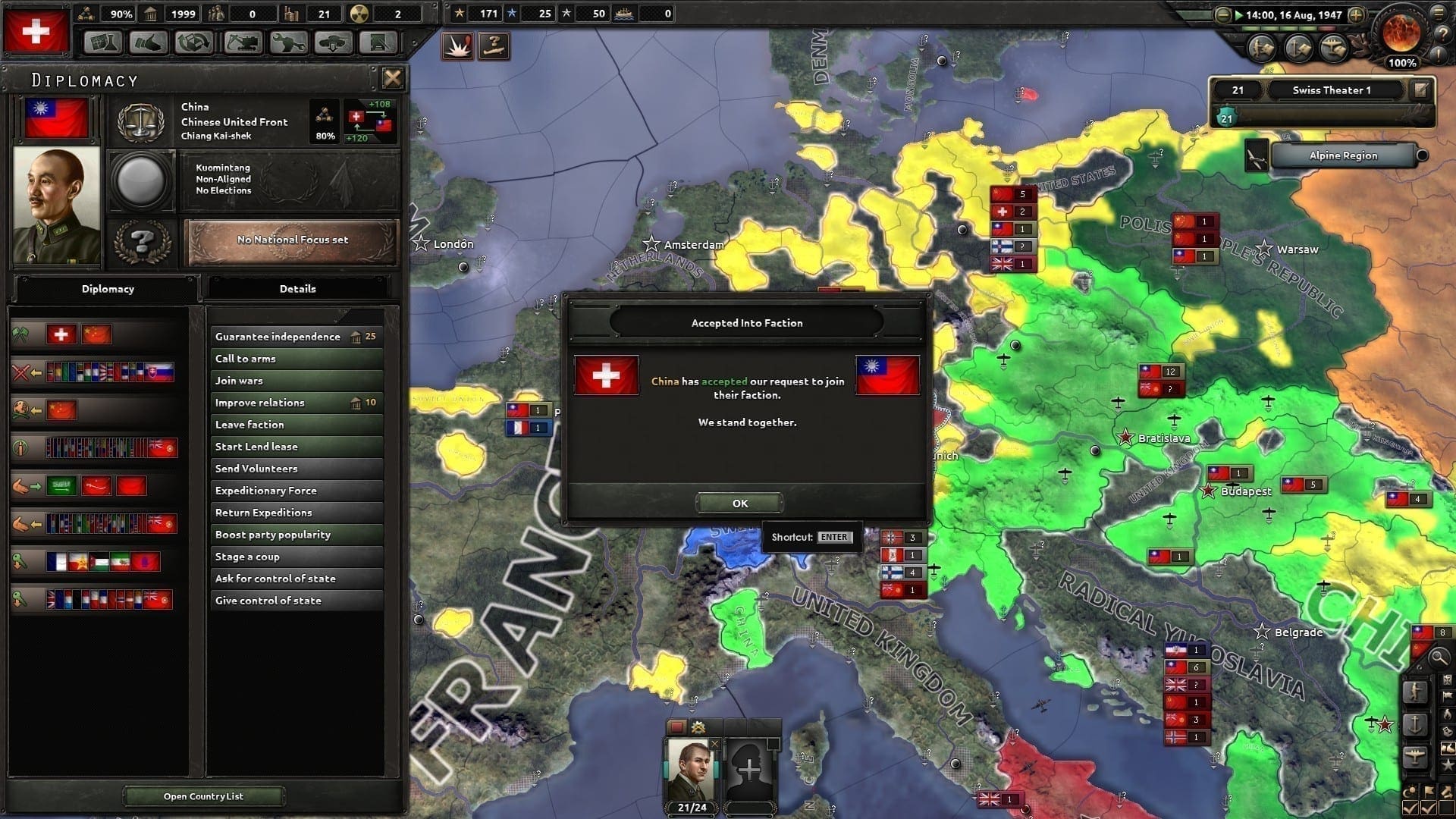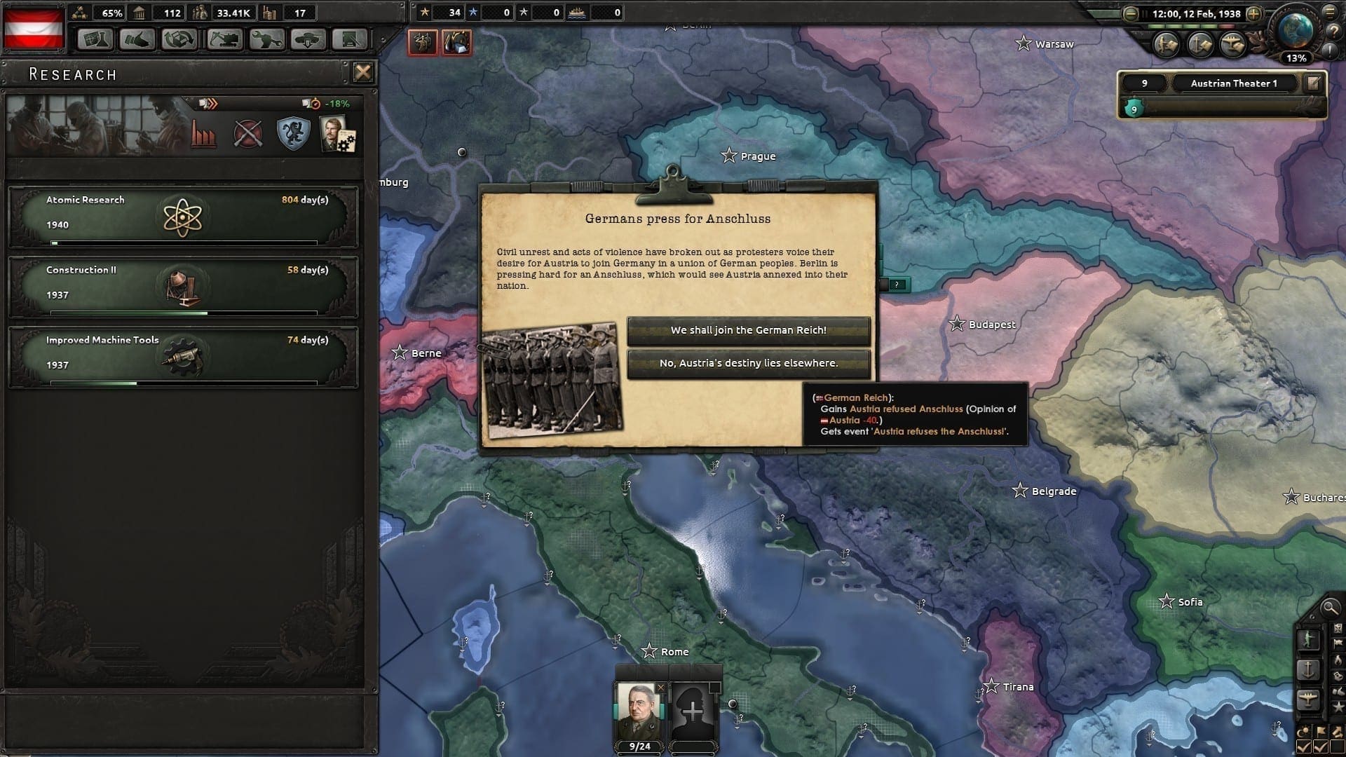 Letztere bedeutet eine Neuerung in strikter Unterteilung von Privat und Militärischer Produktion in den jeweils dazugehörigen Fabriken. Je mehr Fabriken an einer Produktion arbeiten, desto schneller und desto mehr Ressourcen Verbrauch. Diese können wir natürlich wie gehabt auch mit anderen Staaten handeln, jedoch wurde auch hier etwas gedreht und es wird nun gegen zivile Produktionen statt gegen Geld oder andere Ressourcen getauscht. Macht nicht unbedingt Sinn, ist aber so. Apropos Sinn.. nach diesem könnte sich der geneigte Spieler so einige Male fragen, da die Erklärungen auch mit der internen Wiki teils zu wünschen übrig lassen. Auch hier bleibt das Spiel alles andere als Einsteiger- oder generell Überblicksfreundlich, nur allzu oft, vermisst man eine hilfreiche Beschreibung, der Funktionen bzw. Abläufe, welche man gerade benutzt und vor sich sieht. Dies erstreckt sich von der Forschung (ist der Propellerantrieb nun wirklich so viel besser?), Produktion (wieso sagt mir niemand, dass ich den gerade erforschten neue Panzertyp auch im Produktionsauftrag extra auswählen muss), bis hin zum aktuellen Kampfeinsatz, welcher nicht nur im Luftbereich ein Hoch an Unübersichtlichkeit bietet. Ich gestehe an dem Abschuss der Atombombe ziemlich verzweifelt zu sein. Wo wir beim Kampfeinsatz sind, hier ist eine der weiteren Neuerungen und vorgeblichen Vereinfachungen der eisernen Herzen. Den erstellten Divisionen kann man nun Schlachtpläne zuweisen, wie sie im Großen und Ganzen vorgehen sollen. Die Ausführung soll die KI dann selbstständig durchführen. Dies funktioniert mehr oder weniger gut, die Lücken beim Vorstoßen, sollte der geneigte General, denn aber immer im Auge behalten und auf gute, alte Weise selbst schließen. Wirklich etwas übersichtlicher sind nur die Diplomatie-, Forschungs-, bzw. Ideologieentwicklungen geworden. Der Nutzen hiervon ist aber teilweise auch recht fragwürdig, kann man doch ziemlich leicht von einer demokratischen Macht in einen faschistischen Staat „stürzen“, was dann auch ganz schnell einmal diverse freigeschaltete Ideologien unnutzbar macht.