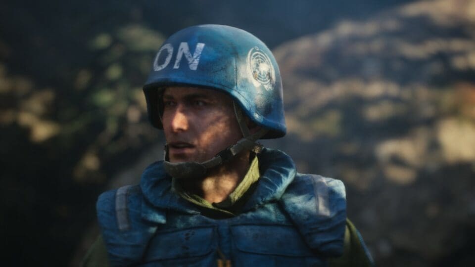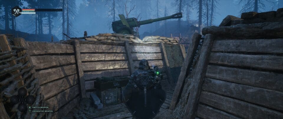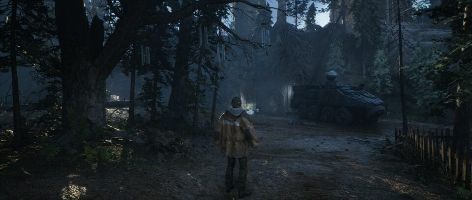 Zu Beginn wählen wir zwischen drei Schwierigkeitsgraden – vom Story-Modus bis zum Albtraummodus. Danach beginnt das Spiel mit einer längeren Einleitungssequenz, die aber mehr Fragen aufwirft als beantwortet. Das eigentliche Spiel beginnt dann als Rückblick. Wir sind Rémi, ein Soldat einer Friedenstruppe, der unerlaubterweise in das Bürgerkriegsland Hadea eindringt. Wir wurden in Hadea geboren, und unsere Eltern sind möglicherweise noch hier. Unsere Uniform lassen wir zurück, Waffen haben wir (mehr oder weniger) keine bei uns. Wir treffen auf einen Bauern, der im Keller seines zerstörten Hauses lebt, seine Söhne wurden im Krieg ermordet. Er gibt uns einen Schlüssel, mit dem wir ein Tor öffnen, um weiter voran zu kommen. Über den (etwas höheren) Zaun klettern geht nicht. Das ist ja noch irgendwie nachvollziehbar, aber warum wir über die ganzen anderen kniehohen Steinmauern/Abgrenzungen nicht einfach drübersteigen können, ist nicht logisch. Ich habe mir gedacht, solche 20 cm hohen, immersionszerstörenden Levelbegrenzungen sind seit Witcher 1 aus der Mode gekommen. Jedenfalls finden wir sehr rasch einen schwer verletzten Soldaten, der neben einem gepanzerten Mannschaftstransportwagen liegt. Er schickt uns auf den Weg zu einem Lager, um ein Medkit für ihn zu holen. Bringen wir ihm das, bekommen wir… einen uralt aussehenden Schlüssel. Den Schlüssel stecken wir nicht weit entfernt in ein Schloss in einem alten Felsen, worauf drei Säulen aus dem Boden hochkommen. Wir können die Säulen, die verschiedene Symbole anzeigen, in mehrere Richtungen drehen. Das erste Rätsel… an den Wänden sehen wir unbekannte Schriftzeichen – ob uns die der Lösung näher bringen?