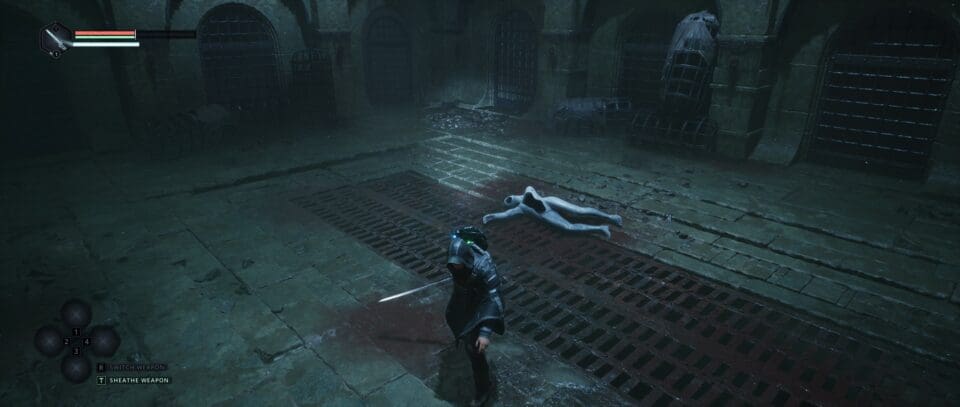 Nachdem wir das erste Rätsel gelöst haben, finden wir im Inneren des alten Gebäudes vor allem eines – Leichen. Dann begegnen uns die seltsamen Wesen zum ersten Mal, und nachdem sich unsere Pistole als wirkungslos erwiesen hat, bekämpfen wir sie eben mit einem Schwert. Dessen Handhabung hat uns eine junge Frau zuvor gezeigt, kurz bevor sie von den seltsamen Monstern getötet wurde. Wir nehmen ihr Schwert, ihren Poncho, ihre Drohne – sie braucht das ja nun alles nicht mehr. Und bald begegnen wir Gegnern, die aus zwei Kreaturen bestehen – einem Walker, und einem Wesen, das aus ihm, mit einer Art Schnur verbunden, herauskommt. Stellt zuerst den Walker ruhig, erst danach könnt ihr den zweiten Gegner verletzen. Und schon erforscht ihr das Land, in dem diese Wesen durch die Gegend ziehen.