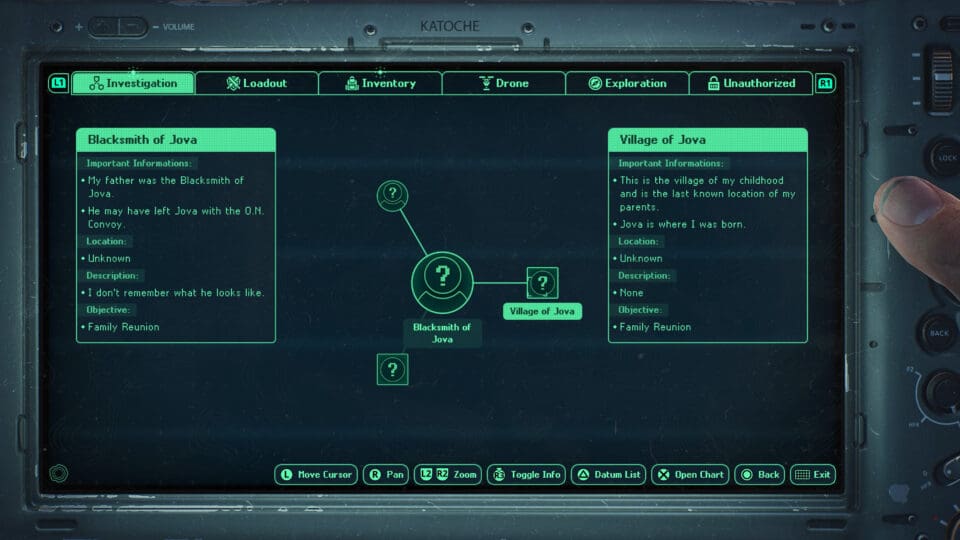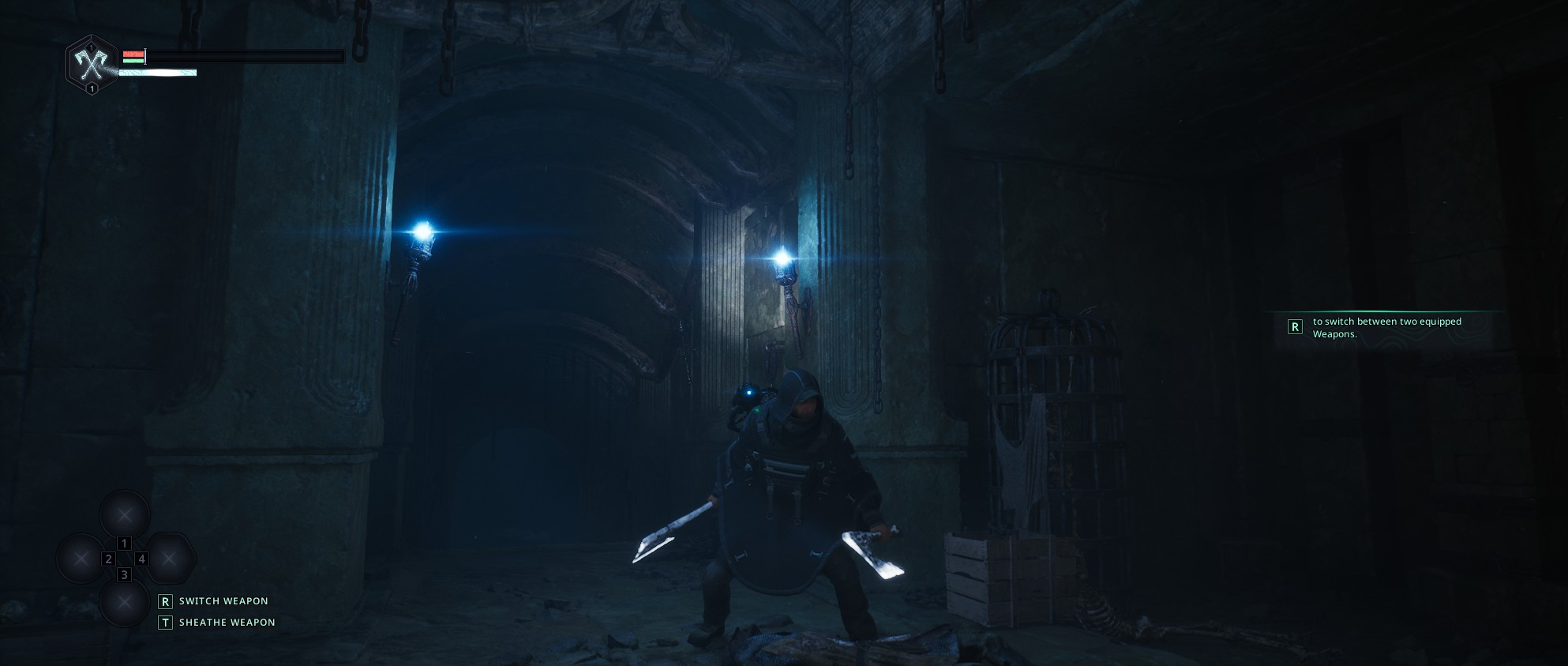 Ihr könnt gehen, laufen, auf Leitern klettern, zuschlagen, blocken, ausweichen – aber nicht springen. Stamina wird verbraucht, wenn wir bestimmte Aktionen ausführen, und regeneriert sich in ruhigeren Phasen. Unser Lebensbalken regeneriert sich jedoch nicht von alleine, da hilft nur ein Medkit. Oder das rasche Aufsaugen von Energie der Gegner, die sie regelmäßig verlieren, wenn wir sie treffen. Mit unserer Drohne können wir Gegner ablenken, das Ding übersetzt uns auch die alten Texte und dient als Taschenlampe. Weitere Funktionen kommen durch neue Module hinzu. Die Drohne sitzt auf unserer Schulter wie ein Papagei, oder wir lassen sie über uns fliegen. Mit NPCs wird durch das Anklicken von Gesprächsthemen geredet, die Gespräche sind vertont. Das Inventar ist recht überschaubar – zwei Waffen, dazu bis zu zwei (zusätzliche) Kleidungsstücke, dazu bis zu zwei Relikte und ein paar Verbrauchsgegenstände. Kosmetische Gegenstände gibt es auch, aber kein Vergleich mit dem ganzen Zeug, das wir in Diablo so herumschleppen. Unser Inventar, ebenso wie die bisher gesammelten Informationen und der Status unserer Drohne können wir mit einem Tablet anschauen, das wir mit uns tragen.
