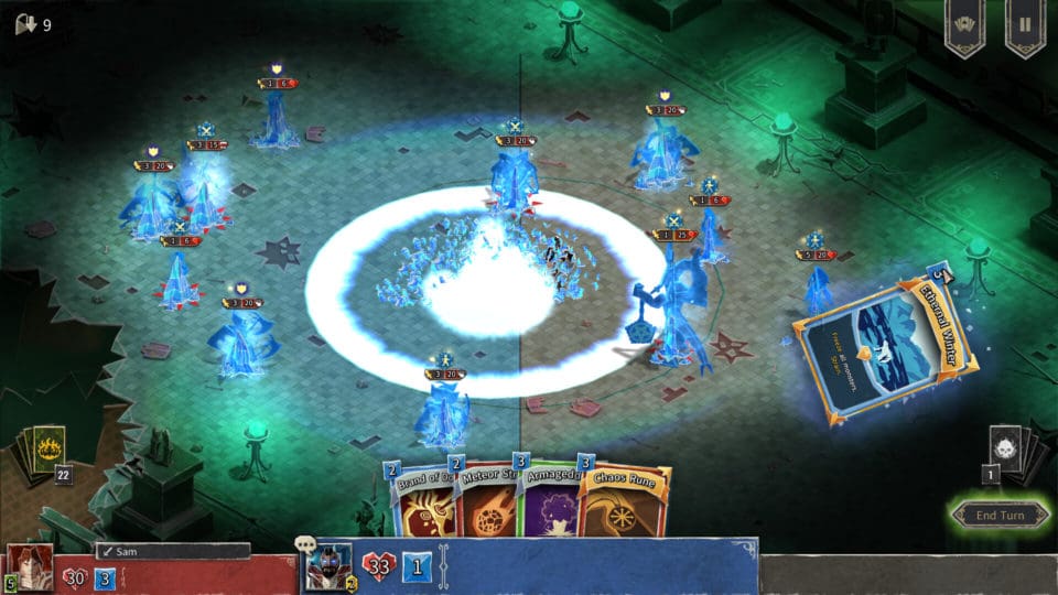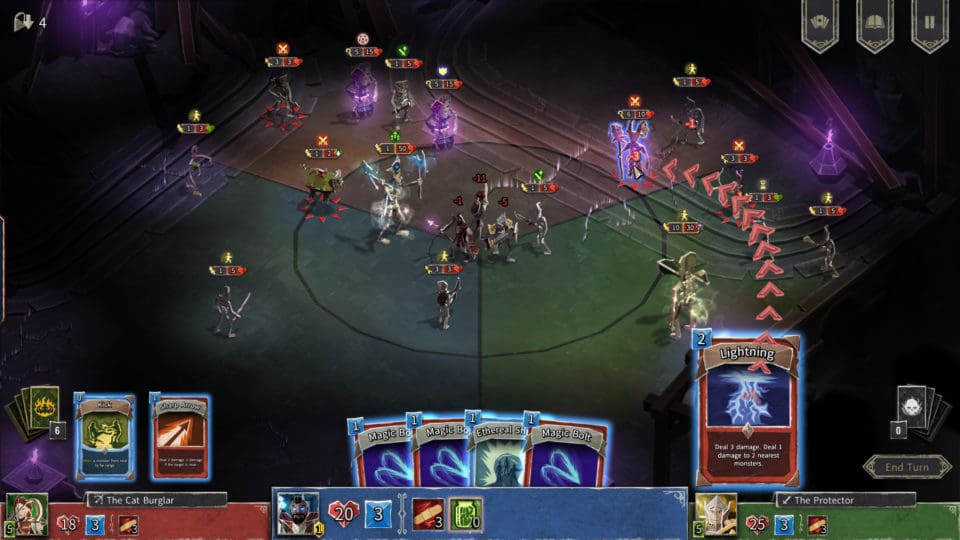 Während Book of Demons ein an Diablo orientiertes Action-Rollenspiel war, ist Hellcard ist ein „Card Battler“, also ein Kartenkampfspiel. Davon sind in den letzten Jahren, vor allem nach dem großen Erfolg von Slay the Spire, ja unzählige erschienen. Aber Hellcard ist nicht nur ein weiterer seelenloser Klon. Die Entwickler haben versucht, neue Ideen in das ein wenig ausgelutschte Genre zu bringen. Das offensichtlichste neue Feature besteht darin, dass es bei den Kämpfen wichtig ist, wo die Monster und eure Helden (Zauberer, Dieb, Kämpfer) tatsächlich stehen. Es wird eine isometrische Darstellung des Kampfes gezeigt, und eure Gegner können sich bewegen. Wenn ihr also einen Feuerregen auf eine bestimmte Fläche regnen lasst, dann sind nur die Gegner davon betroffen, die auch tatsächlich dort stehen. Ich muss sagen, die 2.5D Ansicht funktioniert ganz gut und erweitert die strategischen Möglichkeiten beträchtlich. Ihr spielt wie in einem klassischen Card Battler rundenweise eure Karten, ebenso wie die Gegner, aber zusätzlich bewegen sich eure Gegner, die von allen Seiten in das Spielfeld kommen. Ihr selbst steht in der Mitte des Spielfeldes, das in drei Bereiche aufgegliedert ist, dazu noch in einen Nah- und Fernkampfbereich. Nicht schlecht!