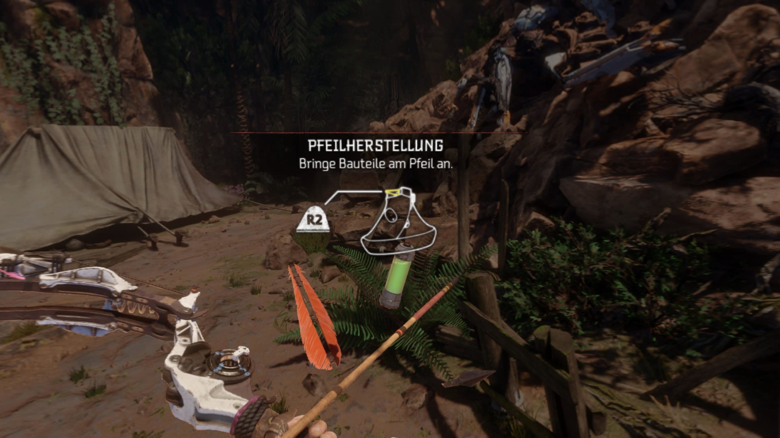Wie in den Vorgängern ist auch in Horizon Call of the Mountain Crafting ein Thema, wenn auch nicht ganz so umfangreich. Pfeile müssen erst hergestellt werden in dem wir Sprengsätze, Spitzen oder Befiederung selbst anbringen. Auch Werkzeuge wie Spitzhaken bekommen wir nur, indem wir die Einzelteile zusammenstecken und mit einem Seil umwickeln um alles zu fixieren. Die brauchen wir um Bretter zu zerschlagen und natürlich zum Klettern. Und es hat schon was für sich, wenn wir beim Klettern immer wieder mal die Spitzhaken auswählen, um bestimmte Wände zu erklimmen. Der Wechsel von Hand zu Hake funktioniert nach einiger Zeit so gut, dass wir die sogar noch während einem weiten Sprung herausholen und sie im letzten Moment in die Felswand schlagen. Das fühlt sich alles schon verdammt cool an!