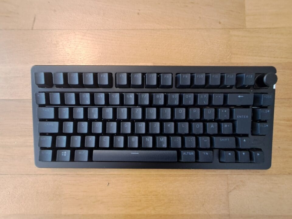Der Formfaktor der HyperX Alloy Rise 75 Wireless ist 75 (im Gegensatz zu 100 für Tastaturen mit Ziffernblock/Nummernblock, oder den ganz stark reduzierten 60ern). Man kann die Größe statt 75 auch als Tenkeyless (TKL) bezeichnen – es fehlt nämlich der auf normalen Tastaturen rechts vorhandene Ziffernblock (mit den zehn Ziffern 0-9, die auf englisch „tenkey“ genannt werden). Mein erster TKL-Rechner war Anfang der 90er mein Commodore Amiga 600, und ich habe das Gerät damals – trotz des putzigen Formfaktors – aus vielerlei Gründen wirklich gehasst. Einer dieser Gründe war der fehlende Ziffernblock. Für viele der damaligen Amiga Spiele (vor allem Flugsimulationen) waren nämlich bestimmte Tasten am Ziffernblock notwendig – und die Möglichkeit der freien Tastenbelegung gab es noch nicht (so einfach). Heute ist das aber halb so wild. Es gibt nämlich kaum noch Spiele, die den Ziffernblock benötigen – und falls doch, ändert ihr einfach die Tastenbelegung. Aus meiner Sicht ist eine kompakte TKL-Tastatur viel praktischer als eine klassische Tastatur – sie belegt einfach viel weniger Platz am ohnehin meist vollen Schreibtisch. Nachdem ich nun schon seit einiger Zeit nur mehr mit TKL-Tastaturen arbeite, will ich nicht mehr zum alten Formfaktor zurückkehren – auch nicht zum Schreiben von Texten oder der Arbeit in Excel.