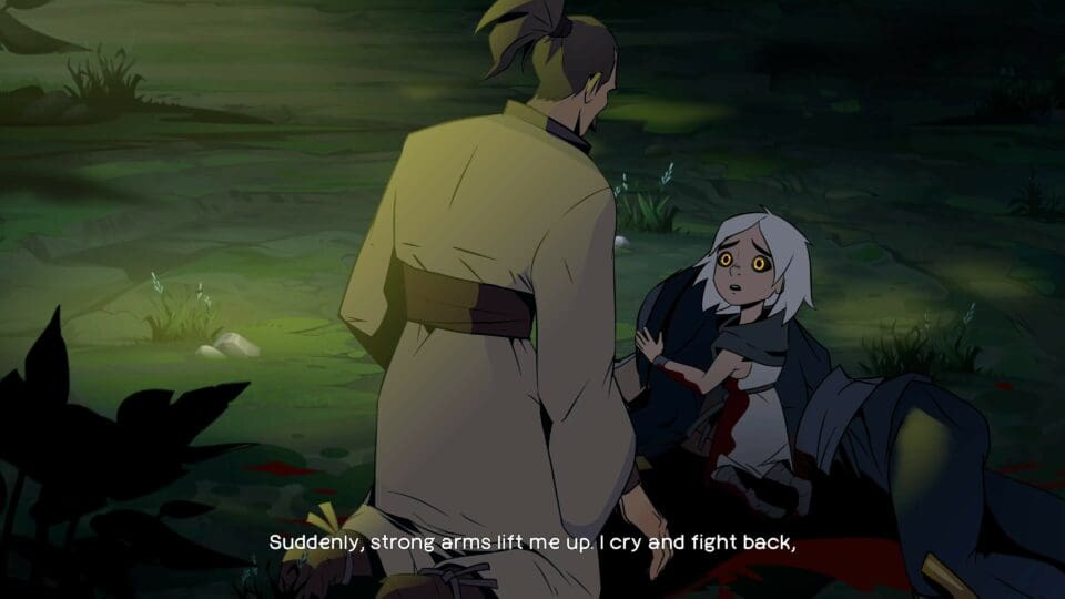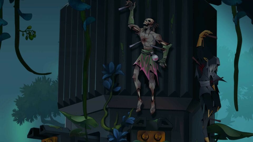 Wir befinden uns in einer Welt, in der die Natur weite Teile der früheren menschlichen Zivilisation zurückerobert hat. Überreste – Skelette und Ruinen – finden sich überall, Inayah bezeichnet die Skelette als Ancient Gods. Für mich schauen sie eher nach unerwartet verstorbenen Menschen in Folge einer Katastrophe aus. Die aktuellen Bewohner der Gegend verehren die toten Menschen jedoch offensichtlich, es finden sich immer wieder Opfergaben, die neben den Skeletten platziert wurden. Insgesamt gibt es also drei Storylines im Spiel – was ist mit der uralten Zivilisation der Ancient Gods passiert? Wer sind die aktuellen Bewohner der Welt – es leben hier offensichtlich mehrere Stämme, die sich nicht unbedingt gut miteinander verstehen. Und wer ist Inayah? All das können wir im Laufe des Spieles herausfinden, und uns auch der einen oder anderen Partei anschließen. Unsere Entscheidungen beeinflussen die Handlung und führen zu unterschiedlichen Enden. Die Geschichte wird dabei über Gespräche, Zwischensequenzen, herumliegende Notizen und vor allem auch durch „environmental storytelling“ erzählt.