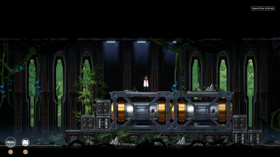 INAYAH – Life after Gods versucht gar nicht erst, das Genre neu zu erfinden. Es hält sich an die in den letzten Jahren etablierten Standards, die wir von einem Metroidvania erwarten. Harte Kämpfe, schwierige Sprungpassagen (mit fiesen Stacheln), Labyrinthe (aber eine automatisch mitgezeichnete Karte), Orte, die wir erst nach Freischaltung neuer Fähigkeiten erreichen können, Backtracking durch die umfangreichen Gebiete (aber mit Schnellreisemöglichkeit). Dazu kommen schwierige Bosskämpfe, viele versteckte Geheimnisse, ein kleiner Roboter als Sidekick, eine mysteriöse Story, eine jederzeit einsehbare Übersicht der verschiedenen Aufträge, ein Bestiarium mit allen bisher begegneten Gegnern, eine Übersicht der bereits absolvierten Tutorials (inklusive kurzen Erklärungsvideos).
