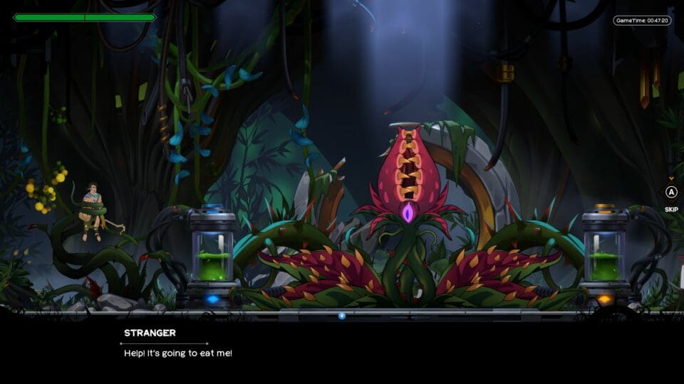 Schon sehr bald begegnen wir aber der unfreundlichen Fauna und Flora – fleischfressende Pflanzen, giftige Sporen ausstoßende Blumen, tödliche Dornenbüsche, die von mir verhassten fliegenden Gegner, kleine stachelige Igel, aggressive Echsen und anderes Ungeziefer… das übliche Repertoire eben. Die Level sind recht verwinkelt, Speicherpunkte (die euch auch wieder vollständig heilen) manchmal ein wenig weit auseinander. Die einzelnen Biome sind zwar unterschiedlich, aber innerhalb der Biome schaut alles ein wenig gleich aus. Ich war mir oft nicht sicher, ob ich an einem Punkt nicht schon vorbeigelaufen bin – und erst ein Blick auf die Karte hat mir bestätigt, dass ich nicht gerade im Kreis laufe. So ähnlich die einzelnen Bildschirme auch aussehen, so detailliert ist der Hintergrund gestaltet – ich habe immer wieder Gefahren zu spät gesehen, weil sie sich in all den kleinen Details gut versteckt haben.