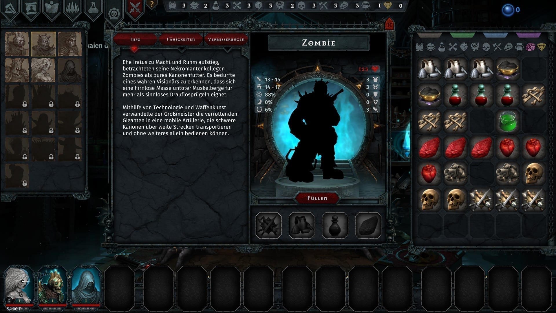 Als frisch gebackener Nekromant schickt man nun seine Truppe aus vier Monstern auf deren Mission Menschen und anderen Störenfrieden das Fürchten zu lehren. Ganz wie das Vorbild, hat jede der Monsterklassen (von denen es insgesamt 18 verschiedene gibt – neben Dauerbrennern wie Zombie und Skelett auch interessante Neuanfertigungen aus der Leichenkammer wie „Iratus Braut“, „Dhampir“ und den gemein gefährlichen „BlutPhantasma“ -) diverse Fähigkeiten, die sie je nach Position in der Gruppe einsetzen kann. Abgerundet wird dies jeweils von einer Wutfähigkeit, die bei erhöhtem Wut Pegel ausgelöst werden kann und naturgemäß umso vernichtenderen Schaden anrichtet. Der Wut Pegel ist wie auch der Mana Pegel eine sich regenerierende Eigenschaft des Nekromanten. Während Mana für seine Zaubersprüche genutzt wird, ermöglicht die Wut die Sonderfertigkeiten der Monster zu aktivieren.