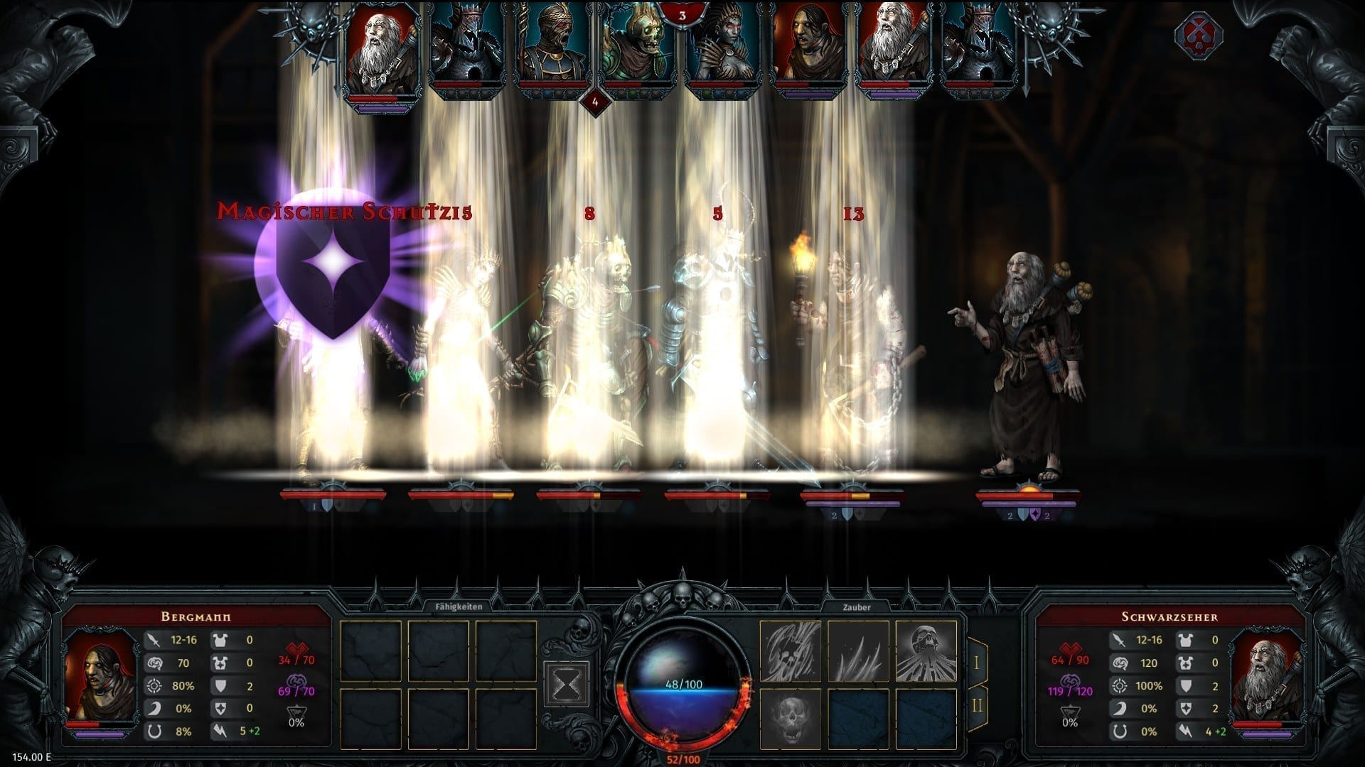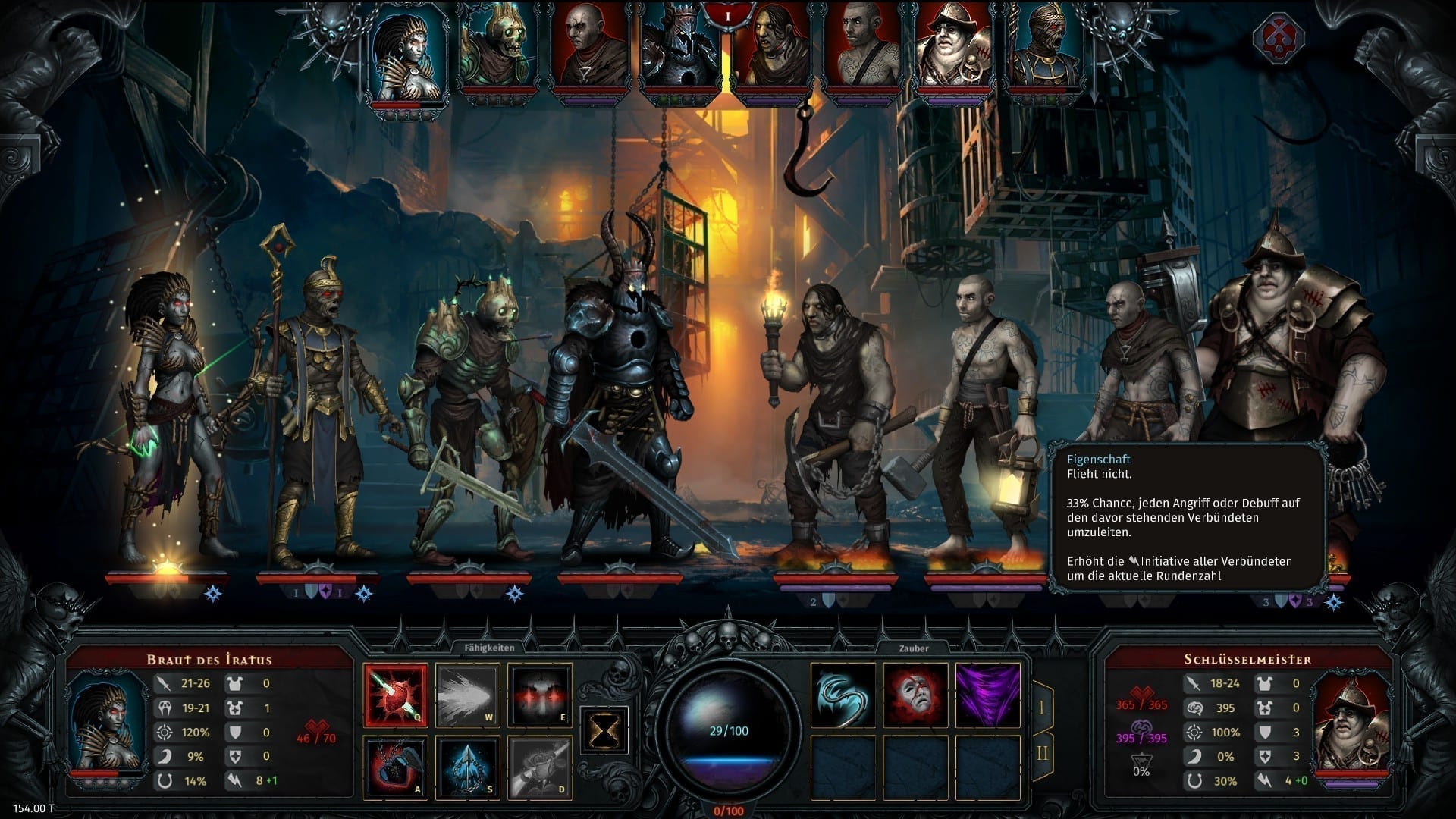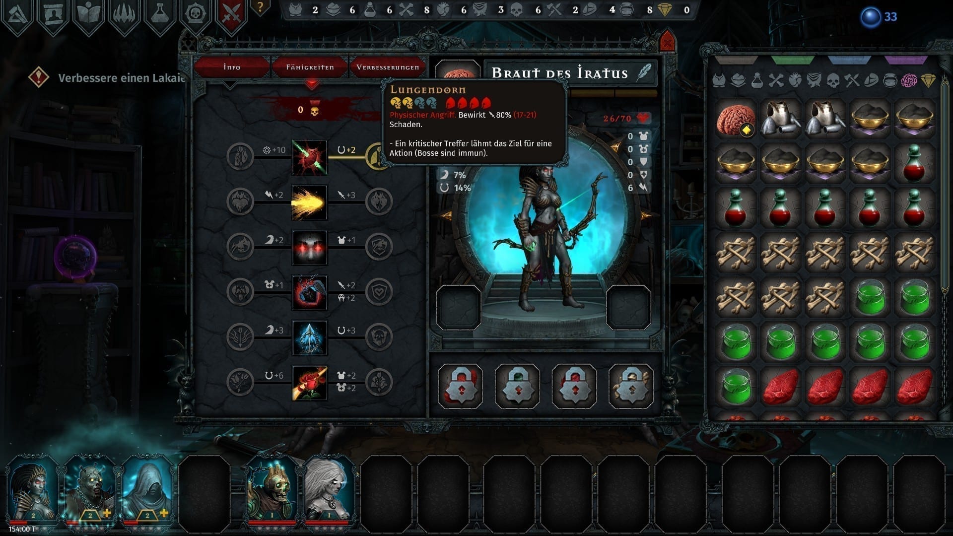 Iratus selbst hat neben alchemistischen und magischen auch einen Zornes- und einen Zerstörungs- Talentbaum, den ihr mit der Zeit und genügend Erfahrung ausbauen könnt. So kann Iratus zum Beispiel pro Runde einen zerstörerischen Zauberspruch auf die Gegner los jagen und dabei die taktische Ausrichtung der Monstertruppe unterstützen. Leider wurde auch das Verschieben innerhalb der Truppe als Zauberspruch eingeordnet, statt wie bei Darkest Dungeon als Aktion des jeweiligen Monsters. Da kann eine Figur, die vom Gegner von hinten nach vorne gezogen wird, schon ziemlich störend wirken.