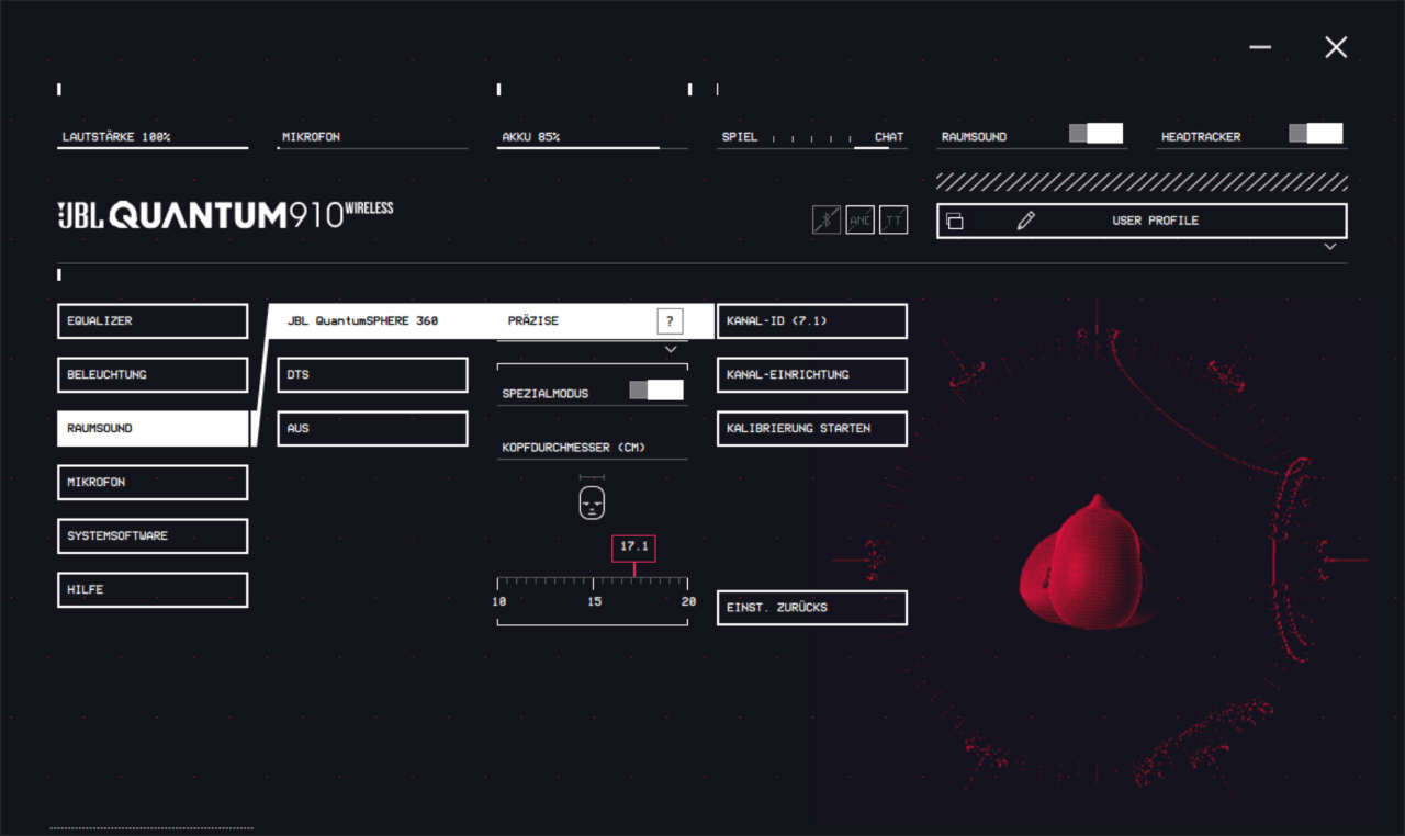 Die Software bietet viele Einstellmöglichkeiten, dazu gehören neben einem Equalizer und der einstellbaren RGB-Beleuchtung auch der Mikrofonpegel und vor allem beim JBL Quantum 910 Wireless die Konfiguration des Raumklangs. Über das JBL QuantumSPHERE360-System kann das Headset mittels dem beigefügtem Kalibrier-Mikrofon an den Raum angepasst werden. Dazu das Mikro anstecken und dann im linken Ohr platzieren, Kopfhörer darüber aufsetzen und der Kalibriervorgang startet. Danach dieselbe Prozedur mit dem recht Ohr durchführen. Das alles lässt sich dann über ein Userprofil abspeichern und jederzeit anpassen. Die Einstellungen dieser Software sind allerdings nur auf dem PC verfügbar.