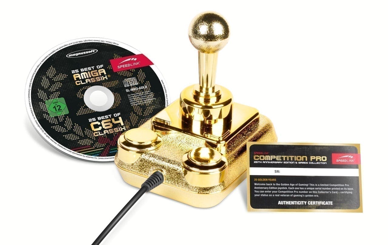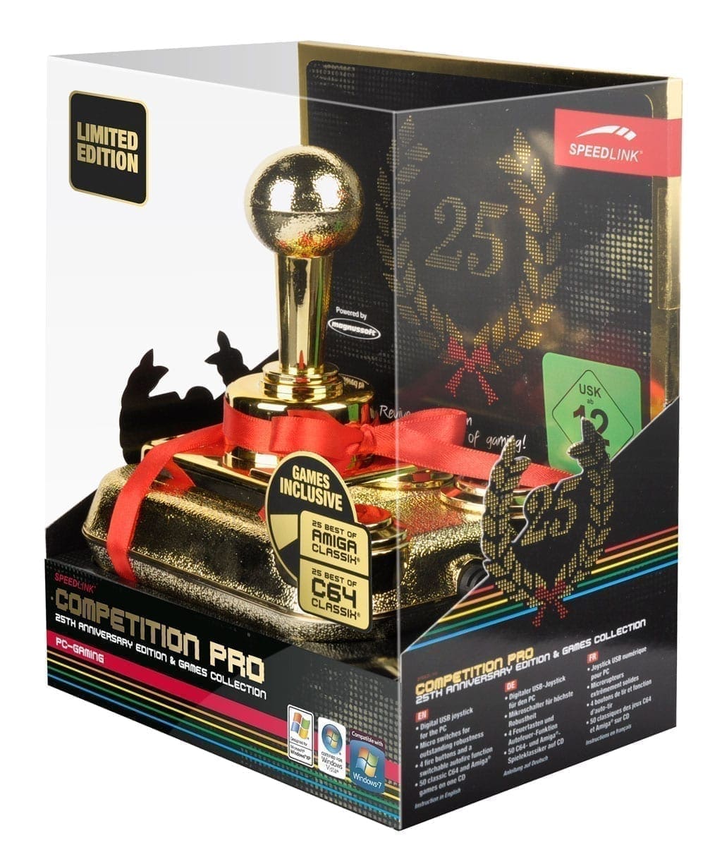 SPEEDLINK verneigte sich anlässlich des 25-jährigen Jubiläums vor diesem unsterblichen Klassiker mit einer limitierten Sonderedition: Die 25th Anniversary Edition verbindet die Robustheit und Präzision des COMPETITION PRO mit einer exklusiven Gestaltung in stilvollem Goldglanz. Der Jubiläumsversion liegt außerdem eine CD-ROM mit 50 originalen Spielen der Heimcomputer-Ära bei: Die jeweils 25 besten Titel aus den Sammlungen „Best of Amiga Classix“ und „Best of C64 Classix“ lassen die Achtziger an jedem Windows-PC wieder auferstehen. Darunter finden sich legendäre Titel wie etwa „Turrican“ für den C64 und „Arkanoid“ für den Amiga. Die Spielesammlungen „Best of Amiga Classix“ und „Best of C64 Classix“ wurden in Kooperation mit der Firma magnussoft zusammengestellt.