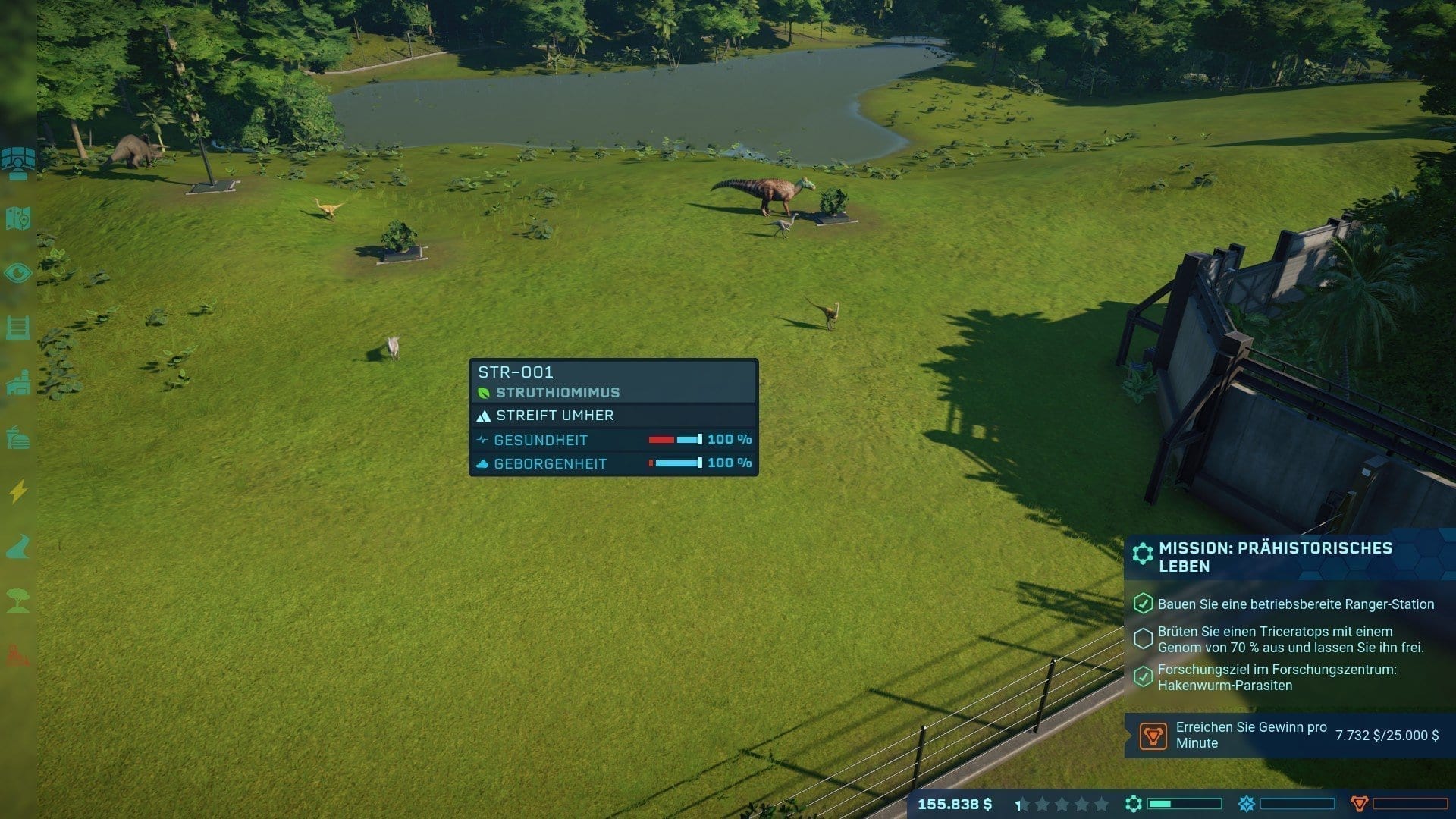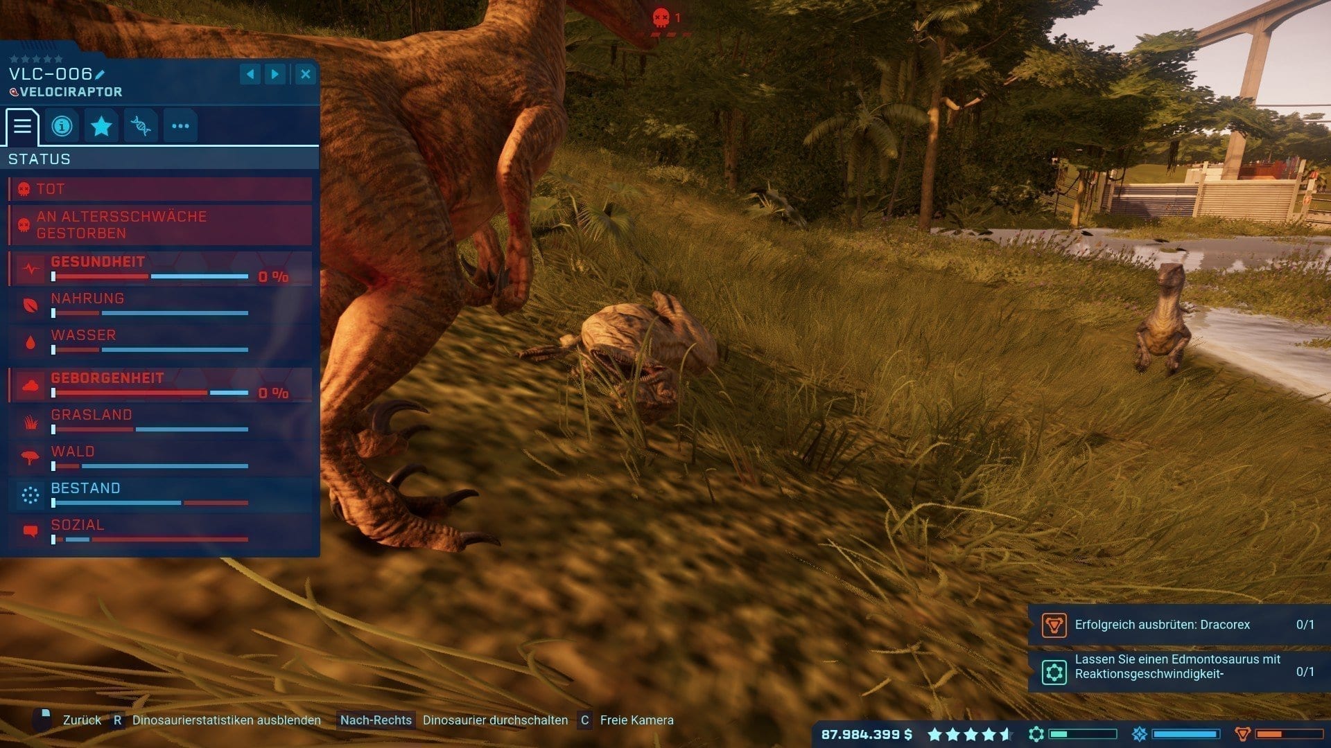 Sehr lobenswert finde ich an dieser Stelle die Darstellung der Dinosaurier. Sie sind toll animiert und verhalten sich so, wie wir uns Dinosaurier vorstellen würden. Leider ist es manchmal schwer die Bedürfnisse der Dinos abzulesen. So hatte ich zum Beispiel einen Diplodocus, der verdurstete obwohl er Knietief in einem See stand oder einen Velociraptor, der unentwegt Panik hatte und verhungerte. Diese Fälle sind zwar ärgerlich, bilden aber meist die Ausnahme.