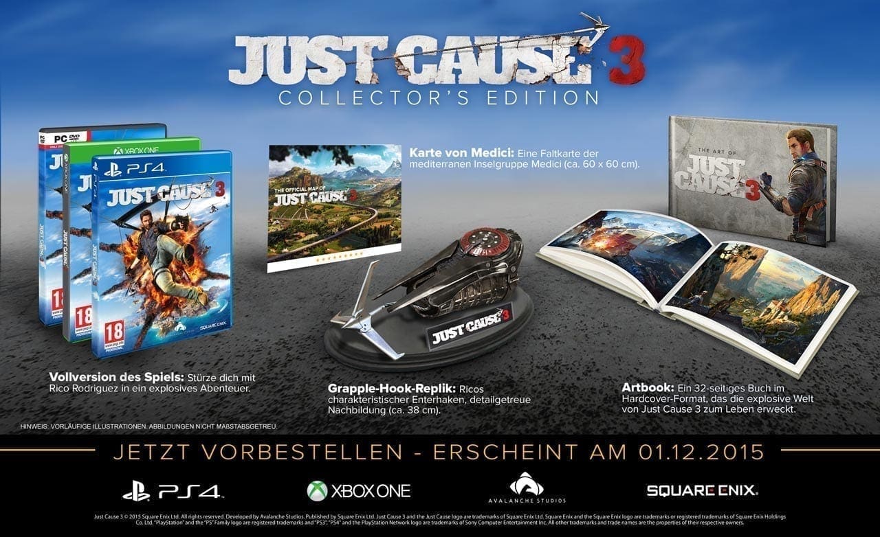 Die JUST CAUSE 3 COLLECTOR’S EDITION erscheint am 1. Dezember 2015 zum Preis von 99,99 EUR für PlayStation 4 und Xbox One, sowie für 89,99 EUR für Windows PC. Vorbestellungen werden in Kürze möglich sein.