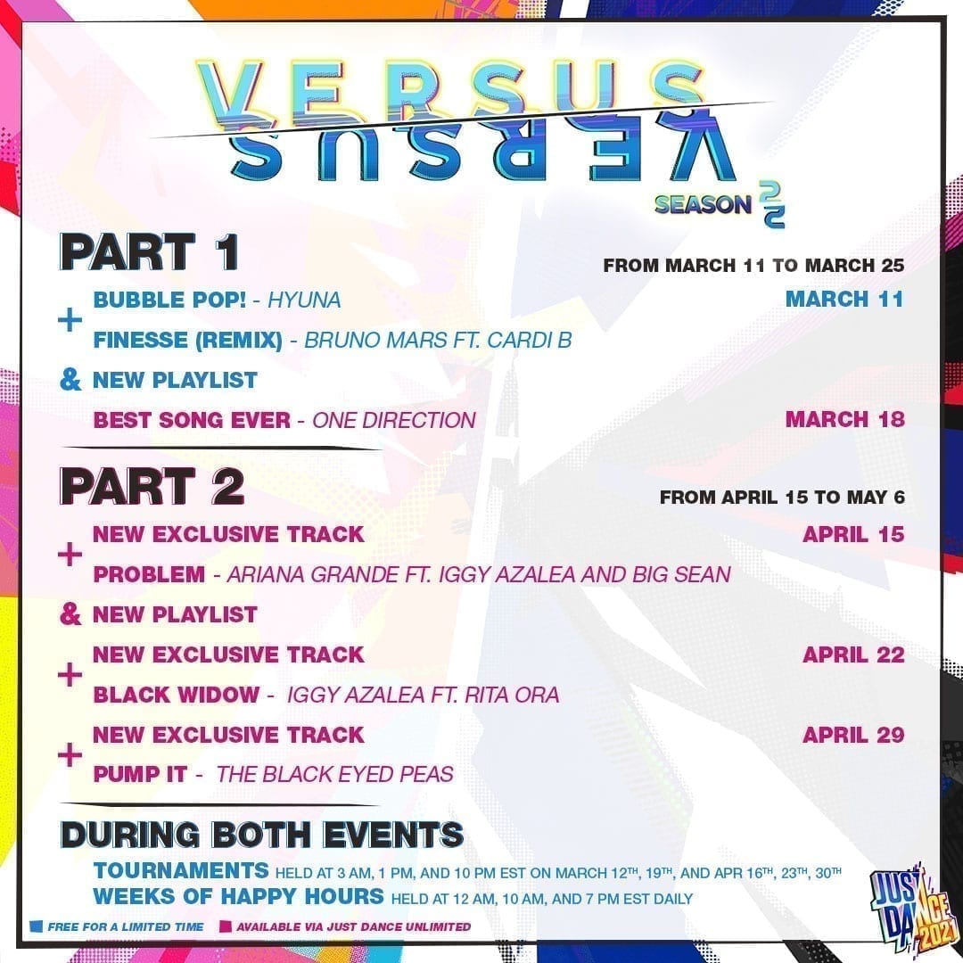 Teil 1 ist ab sofort bis zum 25. März spielbar und bietet eine neue Playlist sowie zwei legendäre Songs, „Bubble Pop!“ von HyunA und „Finesse (Remix)“ von Bruno Mars Ft. Cardi B. Der Song „Best Song Ever“ von One Direction wird ebenfalls als Teil des Events am 18. März zu Just Dance Unlimited hinzugefügt. Alle Songs sind mit einem laufenden Just Dance Unlimited-Abonnement oder einer aktiven Testversion zugänglich