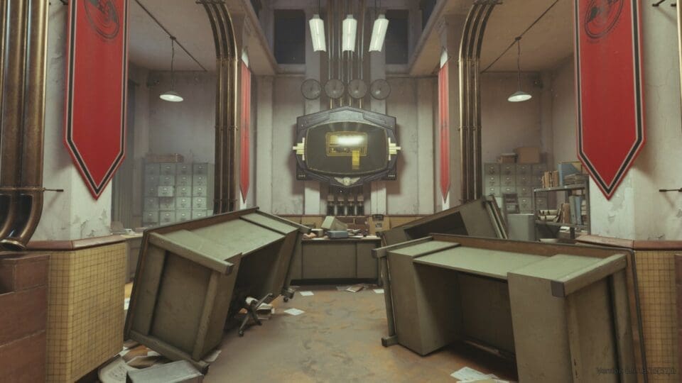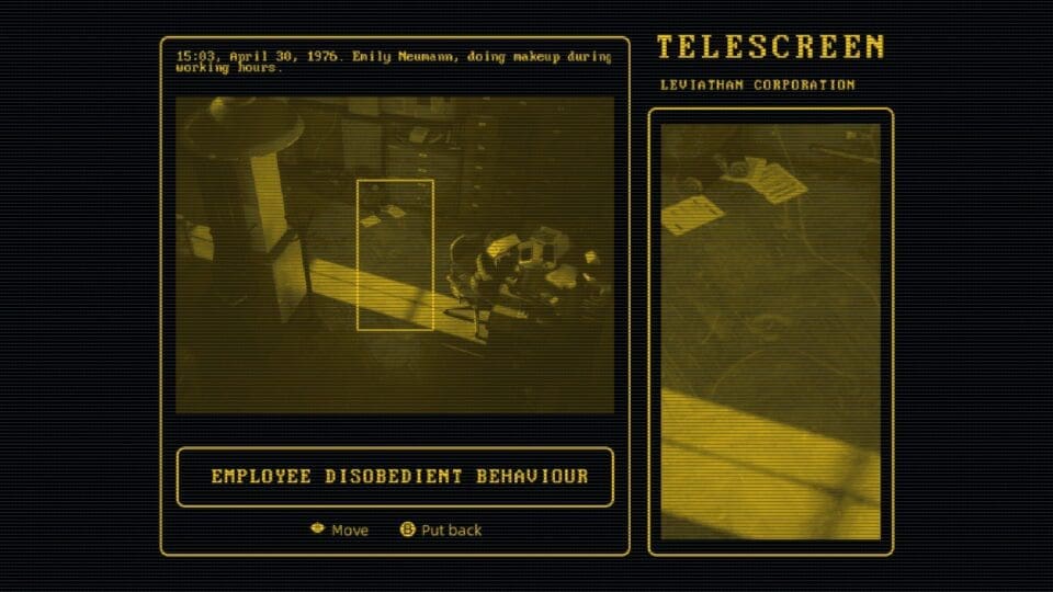 Wir bewegen unsere Figur aus der Egoperspektive durch eine Welt in der Ästhetik der 70er. Der Kopf wackelt (leicht), wer Probleme mit Motion-Sickness hat, sollte das Head-Bobbing daher möglichst rasch in den Einstellungen deaktivieren. Unsere Handlungsoptionen sind beschränkt auf Hotspots, an denen uns der Mauszeiger anzeigt, sobald wir eine Handlung durchführen können. Dinge können oft in die Hand genommen und von allen Seiten betrachtet werden. Manchmal kann man sie auch weiter benutzen, wie beispielsweise Türen oder Laden öffnen. Oder ihr lest Dokumente, gebt Passwörter ein, zieht an Hebeln. An den überall befindlichen Telescreens können wir unsere ID-Karte in ein Lesegerät stecken, um dann individualisierten Inhalt am Bildschirm zu sehen – in unserem Fall Informationen für unsere Arbeit. Uns werden Fotos der allgegenwärtigen Überwachungskameras gezeigt, die für unseren aktuellen Fall relevant sein könnten.
