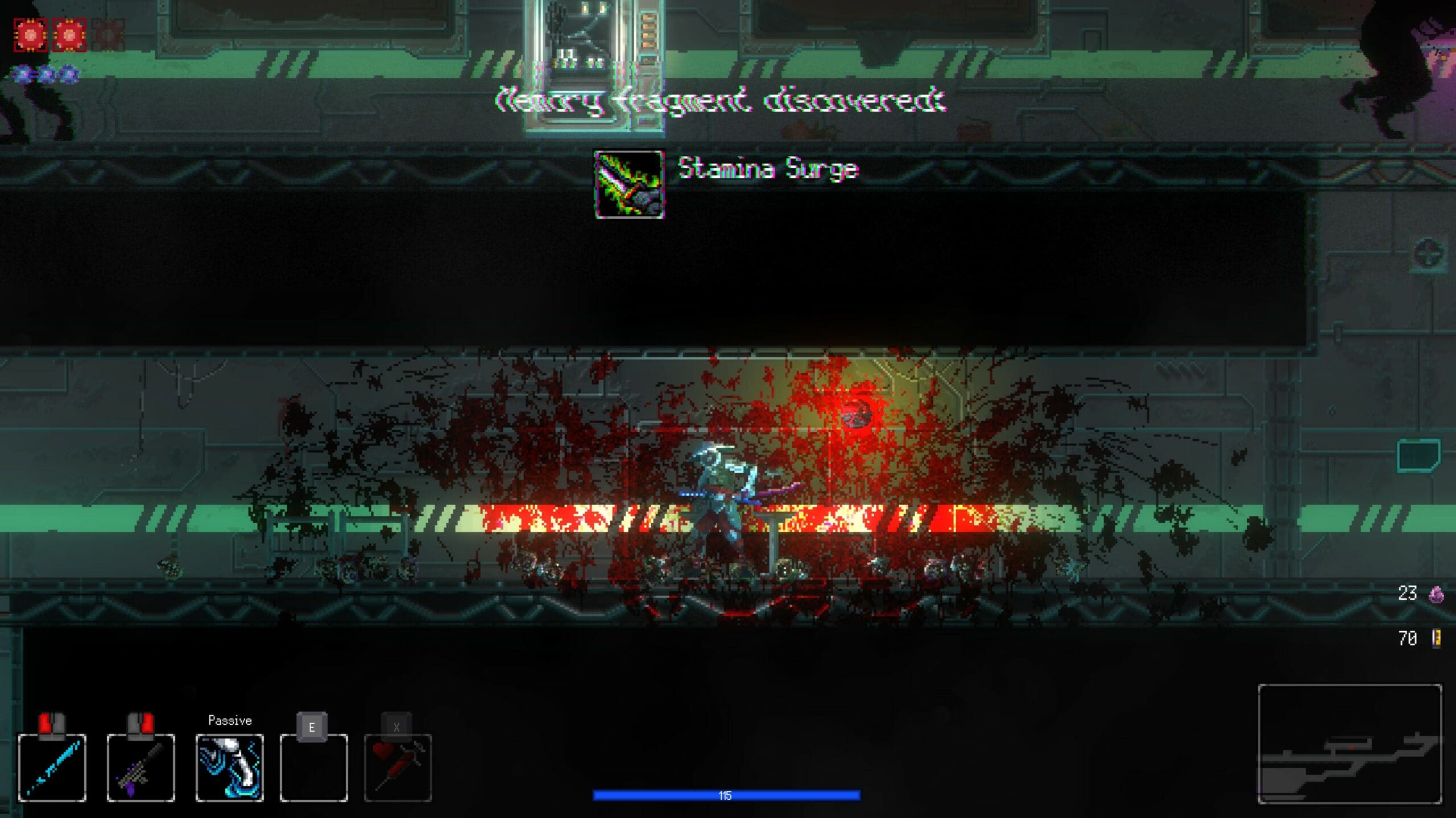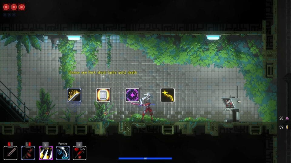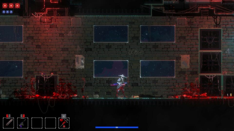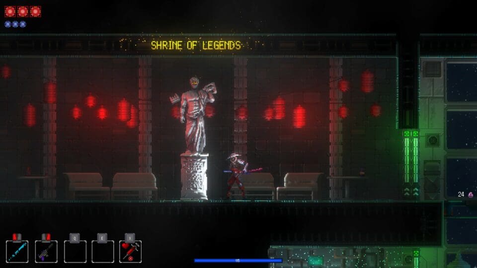 Ihr könnt (doppel-)springen, dashen, mit dem Schwert zuschlagen und mit eurer Pistole schießen. Fügt euren Feinden mit dem Schwert Schaden zu, um eure Pistole zu laden. Oder ihr findet Munition in Kisten, das funktioniert auch und ist realistischer. Mit dem üblichen Walljump (links/rechts) könnt ihr euch enge Schächte nach oben bewegen. Verlorene Lebenspunkte stellt ihr mit einer Injektion wieder her. Wenn ihr aber alle eure Lebenspunkte verloren habt, werdet ihr wieder in den Hub befördert. Dort finden sich eure Verbündeten – beispielsweise der Keeper, der sämtliche von euch gefundenen Erinnerungsfragmente aufbewahrt (Skills, Perks, Waffen und Implantate), der Specialist, der eure Figur permanent verbessern kann, oder eine Katze, die ihr streicheln könnt. Beim Weaver könnt ihr euch ein neues Implantat einsetzen lassen, Captain Chop führt das Bestiarium. Nox ist manchmal anwesend und gibt euch eine neue Fernkampfwaffe.