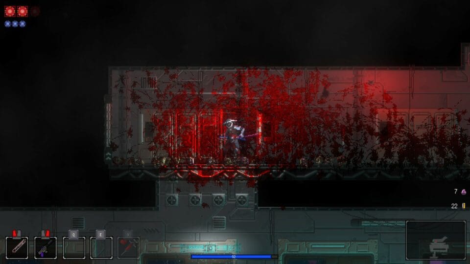 Katanaut ist das Erstlingswerk von Voidmaw. Hinter der Firma steht im Kern ein Solo-Entwickler mit dem Namen Eugene, der mit Katanaut seine Vision eines Sci-Fi Roguelites umgesetzt hat. Und ja, das Spiel ist recht brutal. Eure Gegner sind nämlich Horden von Zombies, die einst Menschen waren. Ihr kämpft vor allem mit eurem Schwert (Katana), mit dem ihr ordentlich Schaden verursacht. Eure Pistole verursacht nur relativ geringen Schaden und muss dauernd nachgeladen werden. Andere Möglichkeiten, ordentlich Schaden auszuteilen lernt ihr im Laufe des Spieles. Euer Freund Carver zeigt euch schon recht früh im Spiel, wie effektiv auch manche Fernkampfwaffen sein können.